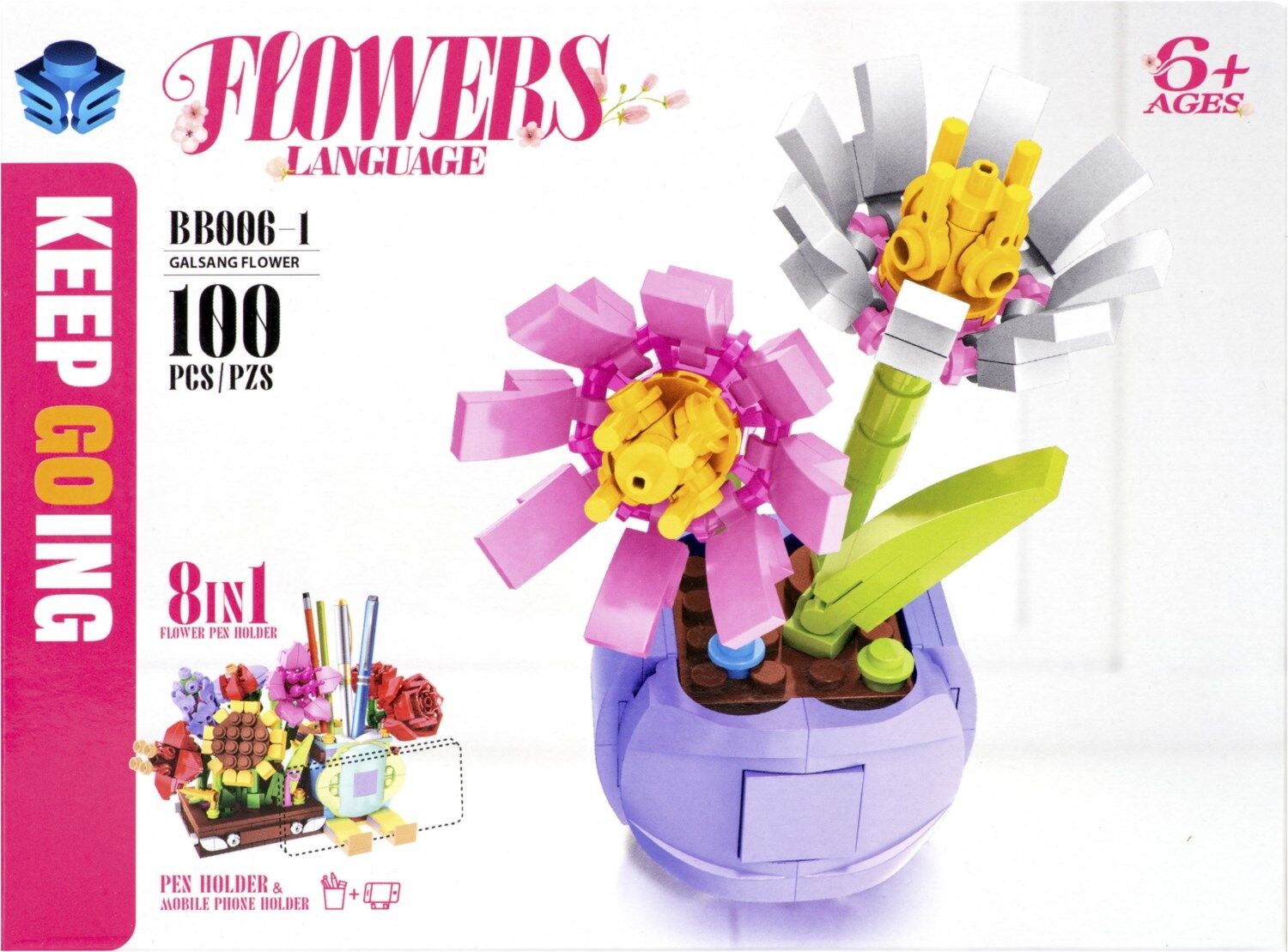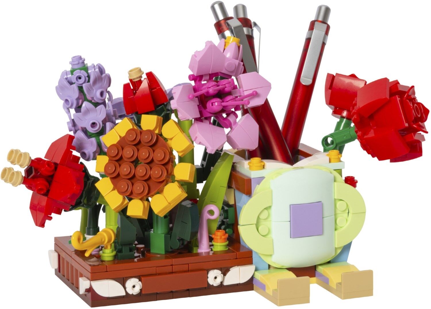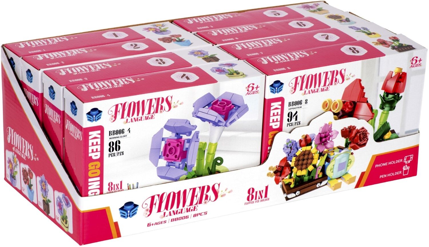 - Acht verschiedene Einzelpackungen, jede mit einem liebevoll gestalteten Blumenelement, die zusammen eine praktische und dekorative Halterung für Stifte und ein Smartphone bilden