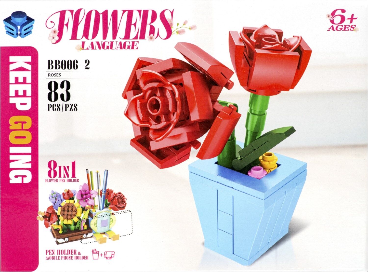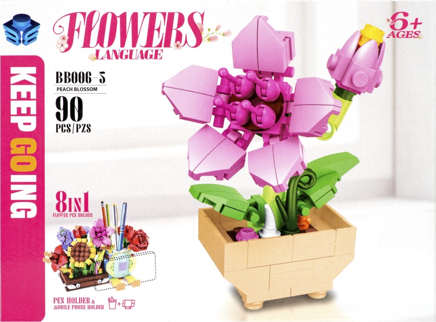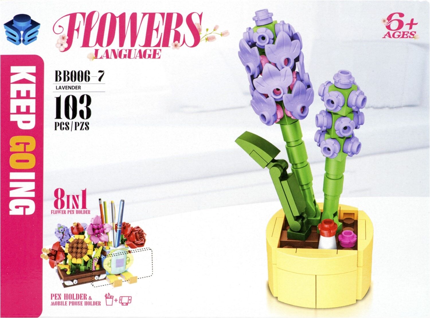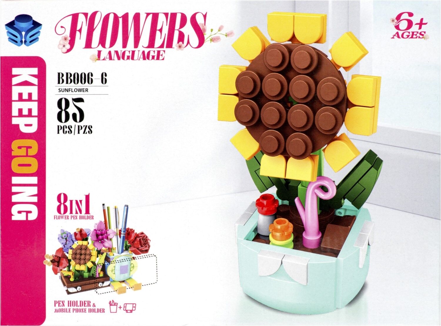- Acht verschiedene Einzelpackungen, jede mit einem liebevoll gestalteten Blumenelement, die zusammen eine praktische und dekorative Halterung für Stifte und ein Smartphone bilden