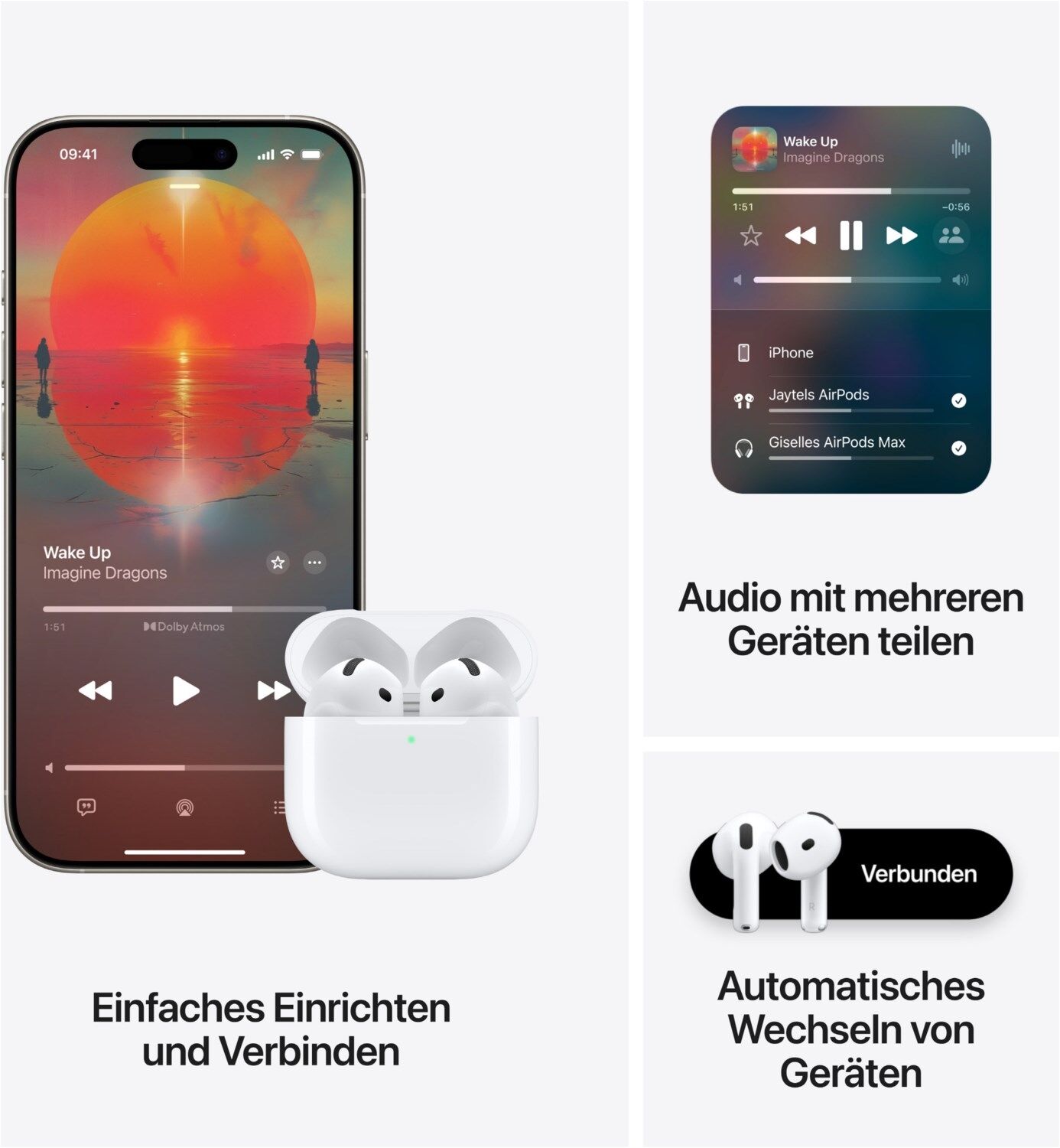 Bitte bei Bildern, die Einrichten mit einem Fingertipp, automatisches Wechseln von Geräten und Audiofreigabe zeigen, die folgenden rechtlichen Hinweise hinzufügen: Erfordert ein kompatibles Apple Gerät mit dem neuesten Betriebssystem. Die Kompatibilität variiert je nach Feature. Einrichten mit einem Fingertipp und automatisches Wechseln von Geräten erfordern einen iCloud Account.