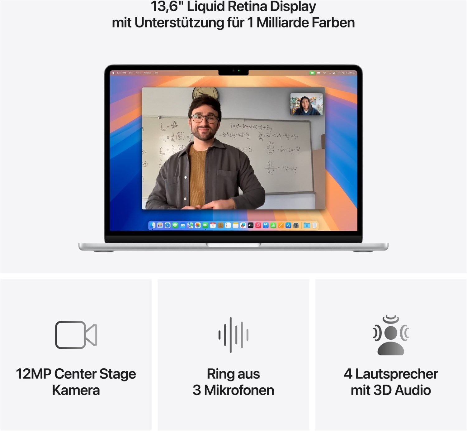 - EIN BRILLANTES DISPLAY - Das 13,6" Liquid Retina Display unterstützt eine Milliarde Farben.³ Fotos und Videos erscheinen mit einem beeindruckend hohen Kontrast und klaren Details, Text ist gestochen scharf
