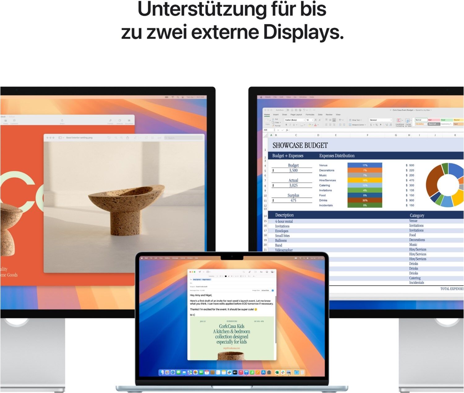 - VERBINDE ALLES - Das MacBook Air hat zwei Thunderbolt 4 Anschlüsse, einen MagSafe Ladeanschluss, einen Kopfhöreranschluss, WLAN 6E und Bluetooth 5.3.4 Und es unterstützt bis zu zwei externe Displays