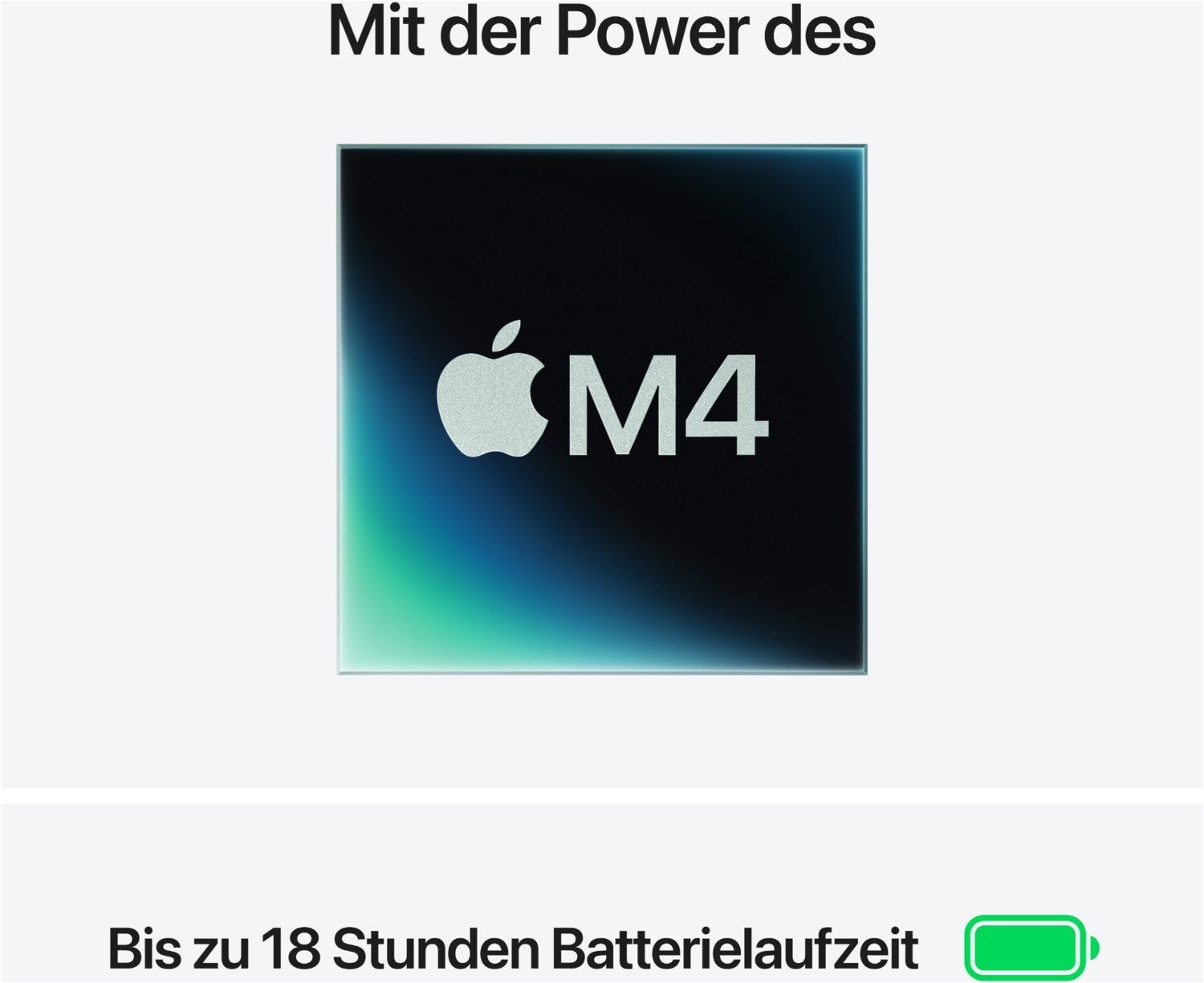 Die Tests wurden von Apple im Januar 2025 durchgeführt mit Prototypen von 13" MacBook Air Systemen mit Apple M4, 10 Core CPU und 8 Core GPU sowie mit Prototypen von 15" MacBook Air Systemen mit Apple M4, 10 Core CPU und 10 Core GPU, alle konfiguriert mit 16 GB RAM und 256 GB SSD. Die Batterielaufzeit für drahtloses Surfen im Web wurde auf 25 gängigen Websites mit einer WLAN Verbindung getestet. Die Batterielaufzeit beim Videostreaming wurde mit 1080p Inhalten in Safari und einer WLAN Verbindung getestet. Alle Systeme wurden mit einer Bildschirmhelligkeit von Stufe 8 und ausgeschalteter Tastatur-Hintergrundbeleuchtung getestet. Die Batterielaufzeit variiert abhängig von Verwendung und Konfiguration. Weitere Infos unter apple.com/de/batteries.