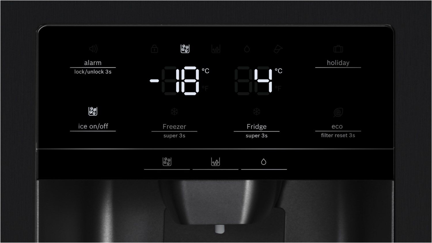 - Eis- und Wasserspender mit Wasseranschluss: Auf Knopfdruck Wasser und (Crushed) Eis ausgeben.