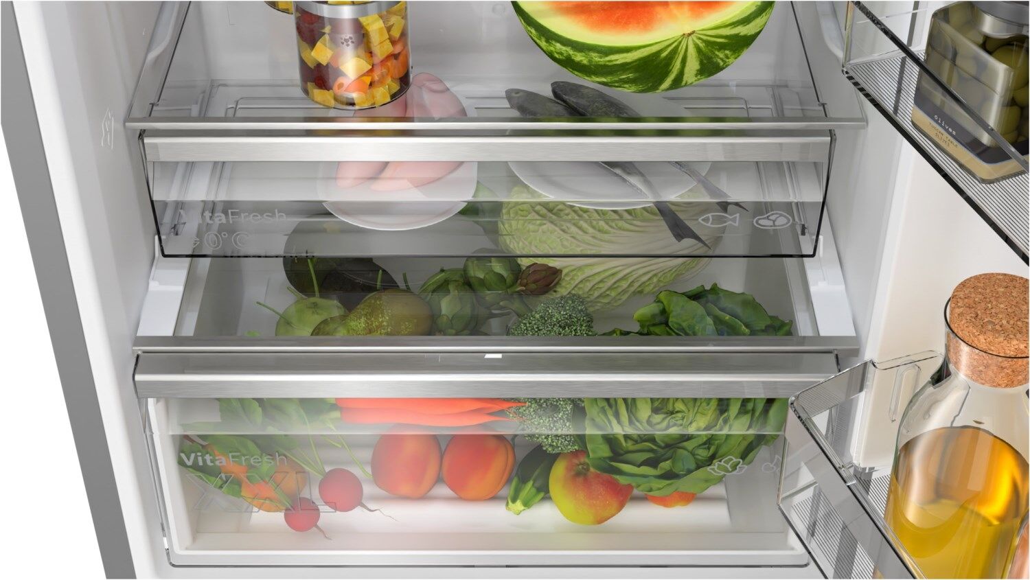 - VitaFresh XXL <0°C>: extragroße Schubladen mit Feuchtigkeitsregulierung für länger frische Lebensmittel.