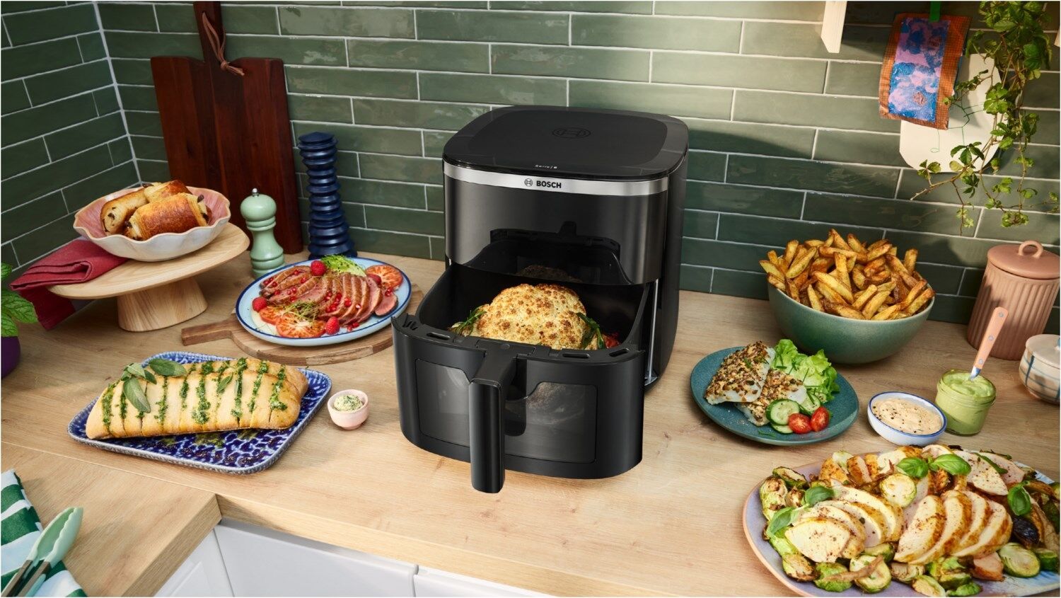 - Gesund kochen mit dem Bosch Air Fryer, da dank der Heißluftzirkulation entweder keines oder nur sehr wenig Fett benötigt wird.