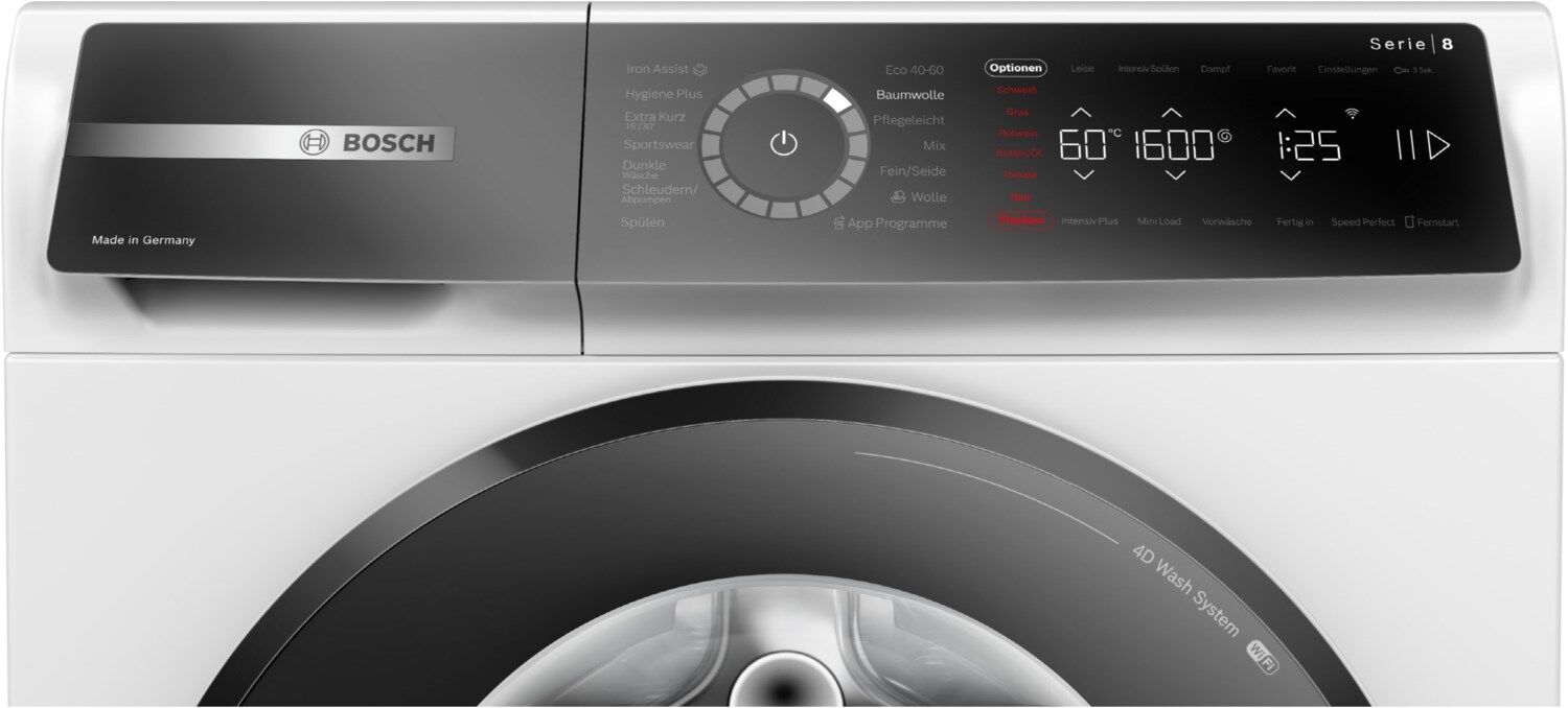 - Fleckenautomatik: standardmäßig 6 Flecken-Optionen und 10 weitere über die HomeConnect-App