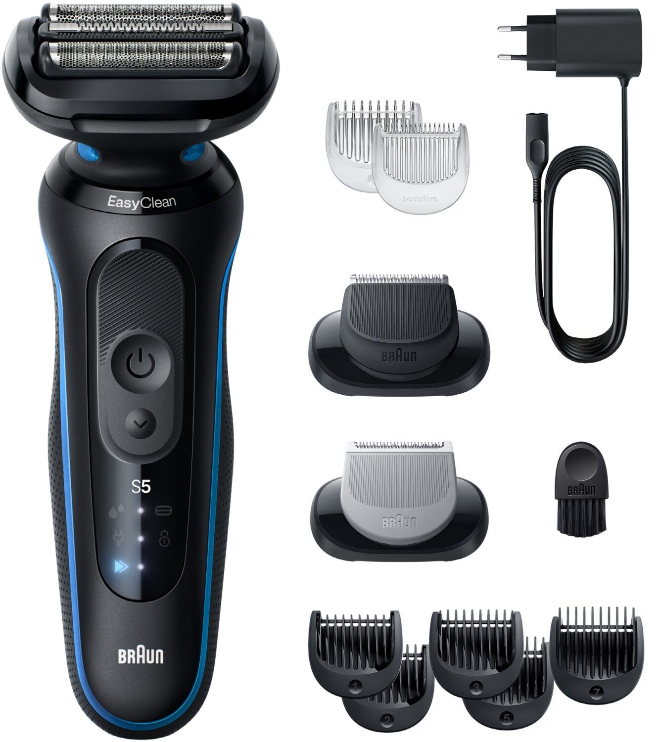 Lieferumfang: 1x Braun Series 5 Rasierer, 1x Schutzkappe, 1x Ladegerät, 1x Reinigungsbürste, 1x Bodygroomer Aufsatz, 1x Barttrimmer Aufsatz.