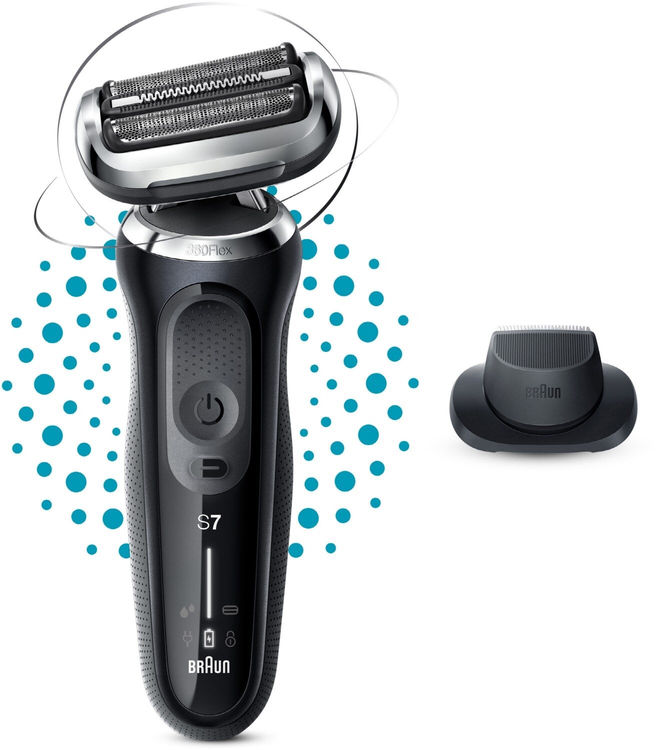 Braun Series 7 Elektrorasierer für Herren mit 360°-Anpassung für eine gründliche Rasur. Mit AutoSense-Technologie, die die Dichte Ihres Bartes erkennt und die Motorleistung anpasst, um mit jeder Rasur noch mehr Haare zu entfernen. Der Lithium-Ionen-Akku sorgt für eine Laufzeit von bis zu 3 Wochen und eine Schnellladung von 5 Minuten, die für eine Anwendung reicht. Dieser elektrische Rasierer für Herren ist 100% wasserdicht und für die Nass- und Trockenrasur geeignet.