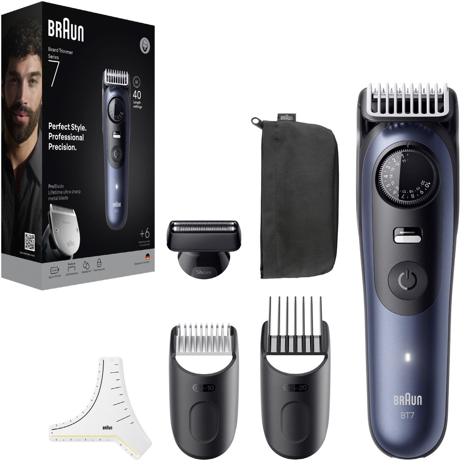 Der Braun Barttrimmer Series 7 wurde für professionelle Präzision und Perfektion bei jedem Zug entwickelt. Mit der langlebigen, ultrascharfen ProBlade-Klinge und der innovativen AutoSense-Technologie erfasst dieser Barttrimmer selbst die anspruchsvollsten Haare mühelos. Fehler sind dank der Feststelltaste ausgeschlossen und die 40 Längeneinstellungen ermöglichen eine perfekte Kontrolle über das Styling. Ob Trimmen, Rasieren, Konturieren oder Detailgestaltung - dieser Trimmer bietet die besten Tools für perfekte Kanten, Übergänge und Abschlüsse.Lieferumfang: 1 Barttrimmer, 2 Kammaufsätze, 1 Scherkopf, 1 Bartschablone, 1 Etui, 1 Reinigungsbürste