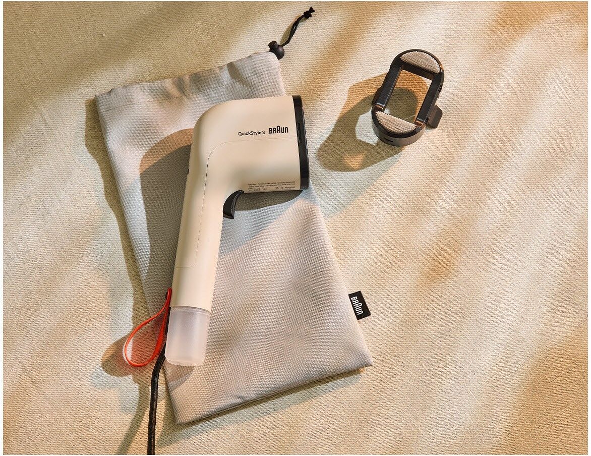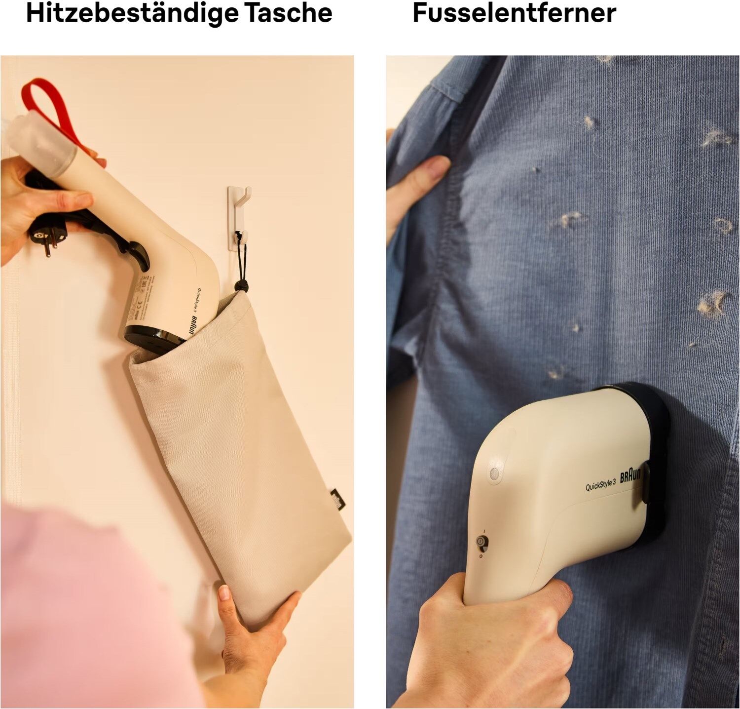 Beim QuickStyle 3 Dampfglätter ist ein praktischer Fusselentferner und eine hitzebeständige Aufbewahrungstasche im Lieferumfang enthalten.