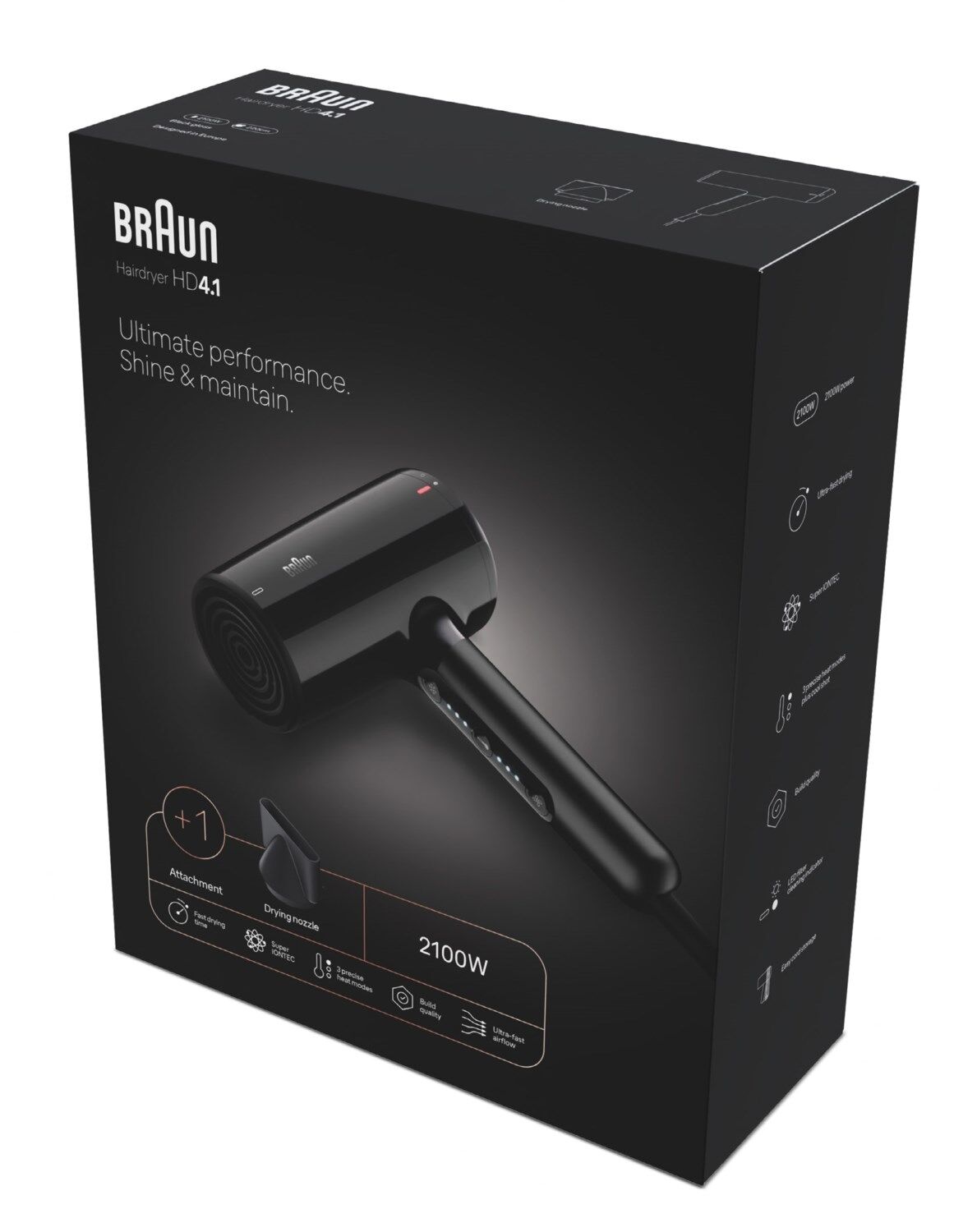 Der Hochleistungs-Haartrockner Braun HD4.1 mit 2100 Watt und innovativem HTDC-Motor erzeugt einen ultra-präzisen Hochgeschwindigkeits-Luftstrom und ermöglicht ein schnelleres Trocknen bei niedrigeren Temperaturen als herkömmliche Haartrockner.