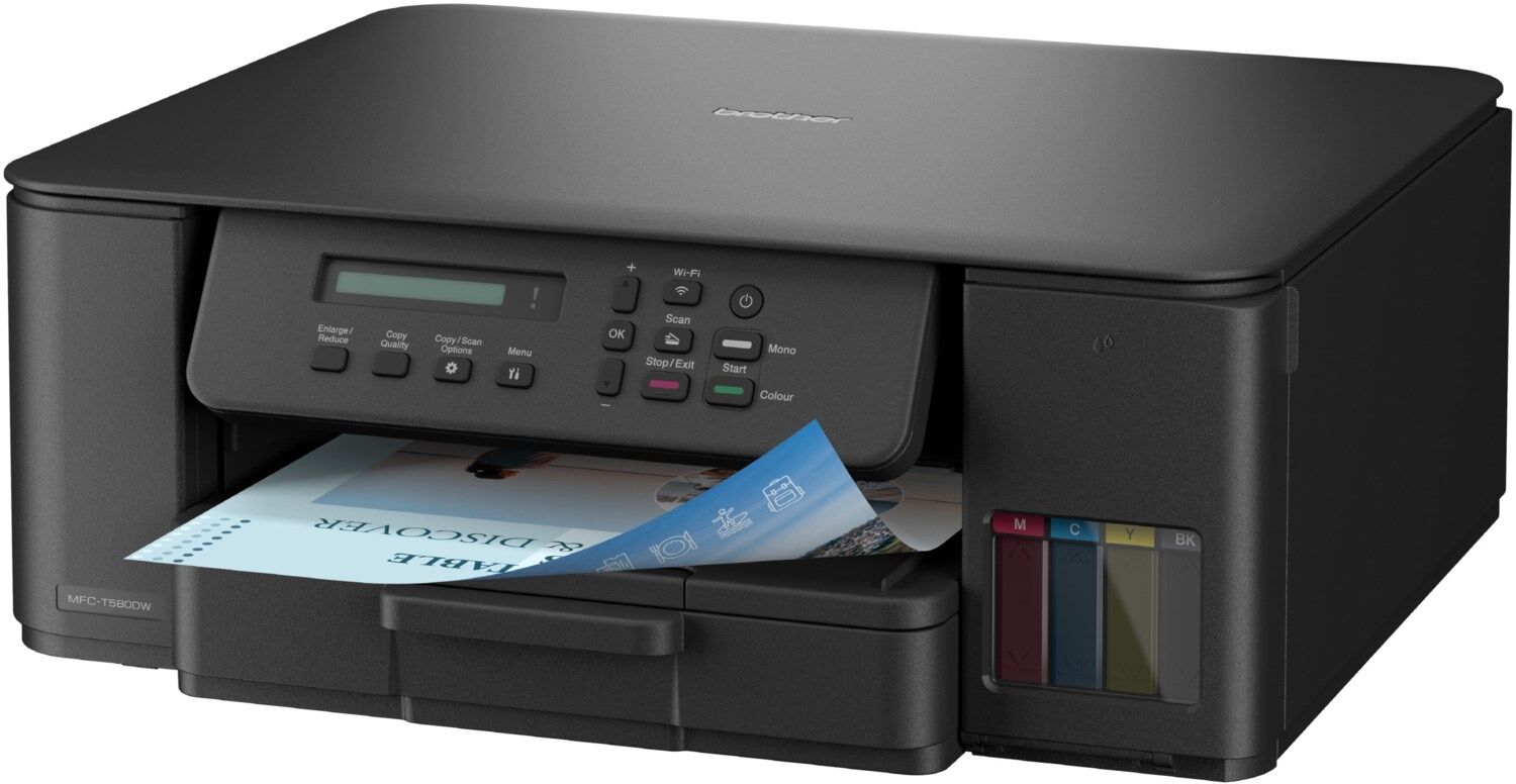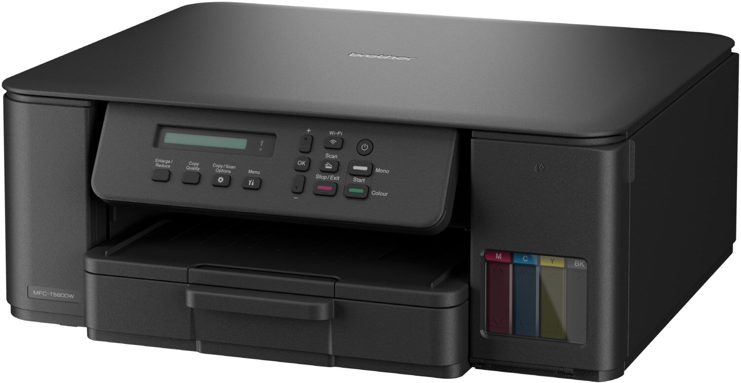 Der kompakte DCP-T580DW Drucker druckt mit Hilfe großer Tintenflaschen länger, welche die Kosten pro Farbseite reduzieren. Füllen Sie die Tanks innerhalb von Sekunden, ohne die Flaschen festzuhalten, was das Befüllen einfach und sauber macht. Das Key-Lock-Bottle-System gewährleistet Ihnen, dass Sie immer die richtige Farbe nachfüllen.