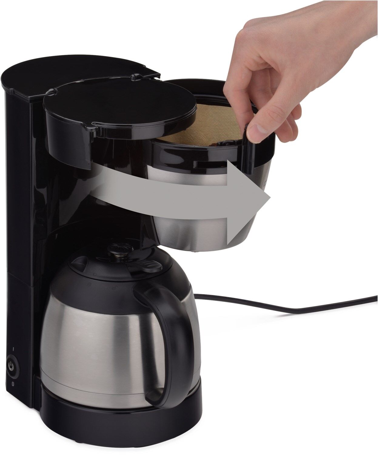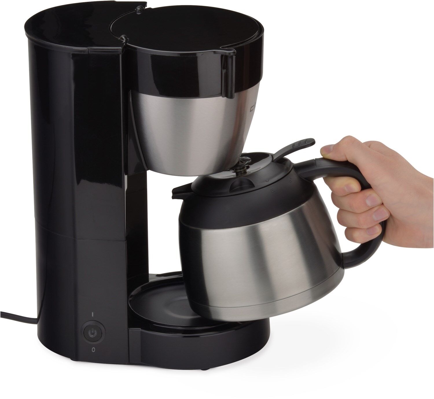 Filterkaffee nach bewährter, guter Art Tropf-Stopp-Funktion Schwenkfilter Ein-/ Ausschalter mit Kontrolllampe Automatische Abschaltung Herausnehmbarer Filtereinsatz, Filtergröße 1x4 Isolierkanne aus Edelstahl Schwarzes Kunststoffgehäuse mit Edelstahl H = 31 cm x B = 15 cm x L = 28 cm