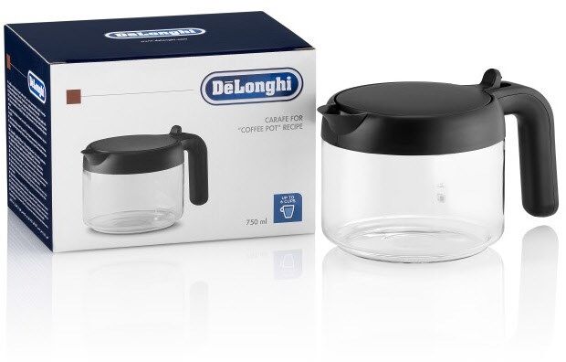 Kaffeekanne aus Glas mit klappbarem Kunststoffdeckel Bis zu 6 Tassen Kaffee Fassungsvermögen: 750 ml Glaskanne mit Füllstandsanzeige (2/4/6 Tassen) Praktischer Klappdeckel Einfache Handhabung dank handlichem Kunststoffgriff Spezieller Ausguss zum leichteren Ausgießen Dezente De‘Longhi-Logo Prägung am Griff Positionierung auf Abtropfschale der Kaffeemaschine unter dem Kaffeeauslauf