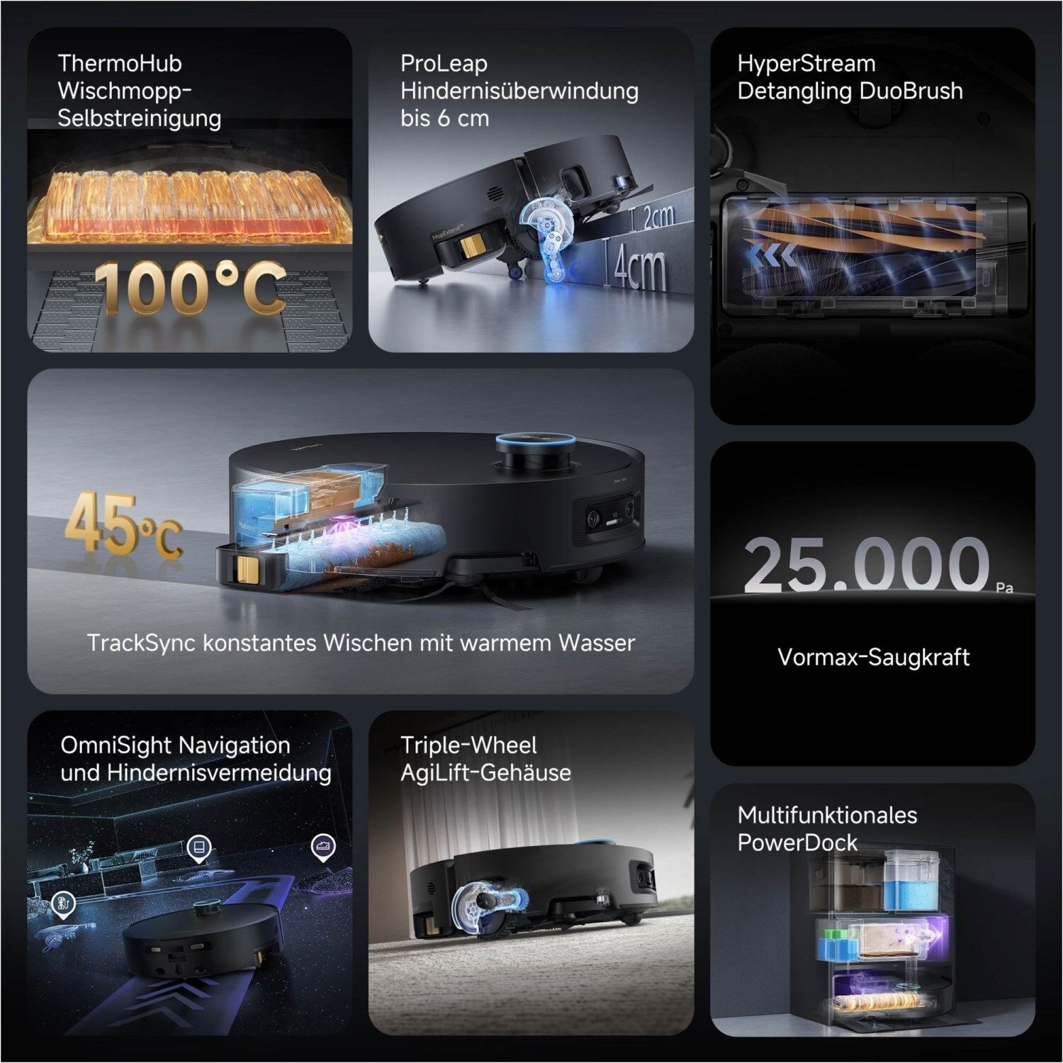 Starke Saugleistung: Mit einer beeindruckenden Saugleistung von 25.000 Pa entfernt der Roboter selbst tiefsitzenden Staub, Krümel und Tierhaare zuverlässig. Die innovative HyperStream™ Detangling DuoBrush verhindert, dass sich Haare in der Bürste verheddern – perfekt geeignet für Haustierbesitzer.