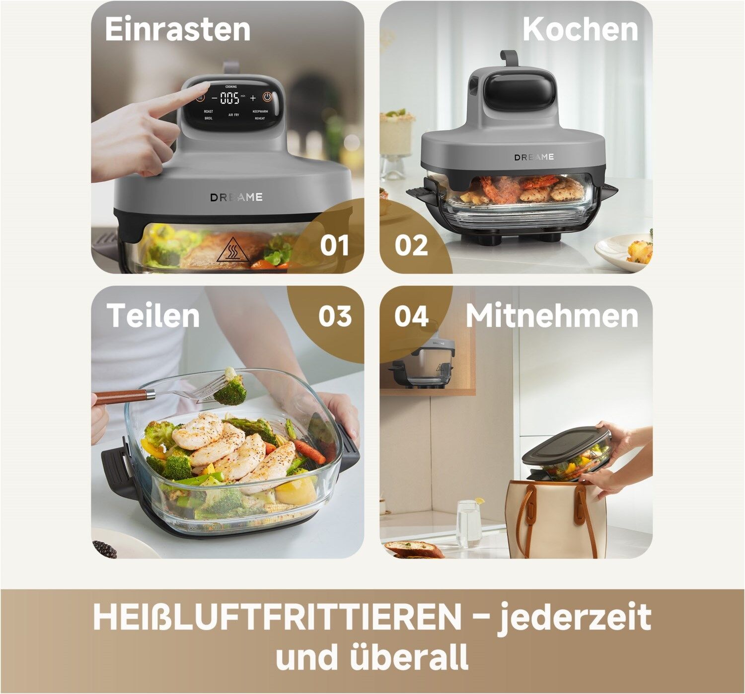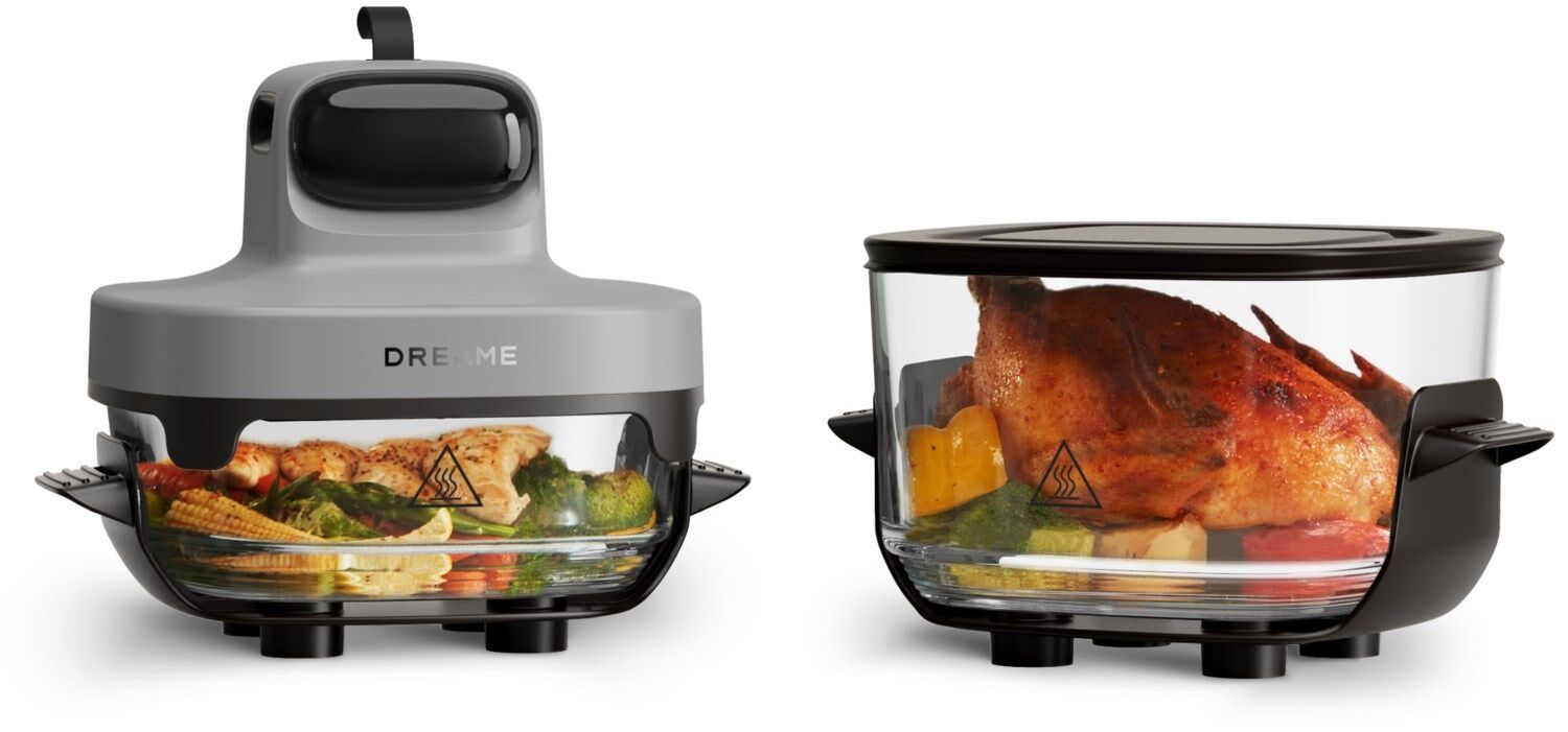 Die Dreame Tasti™ PT60 Heißluftfritteuse macht gesundes Kochen einfach wie nie. Mit zwei Glasbehältern (2,5 L und 4,5 L) bereiten Sie kleine Snacks oder ganze Mahlzeiten mühelos zu – ganz ohne Fett, Beschichtung oder unangenehme Gerüche. Durch die 3D-Heißluft- und Dampfinfusions-Technologie werden Speisen außen knusprig und innen saftig. Über das klare LED-Display wählen Sie bequem aus fünf automatischen Kochprogrammen. Die PT60 besteht aus hitzebeständigem Borosilikatglas und Edelstahl, ist mobil, kompakt und ideal für Küche, Büro oder Camping. Gesünder genießen – überall, jederzeit und ganz einfach auf Knopfdruck.