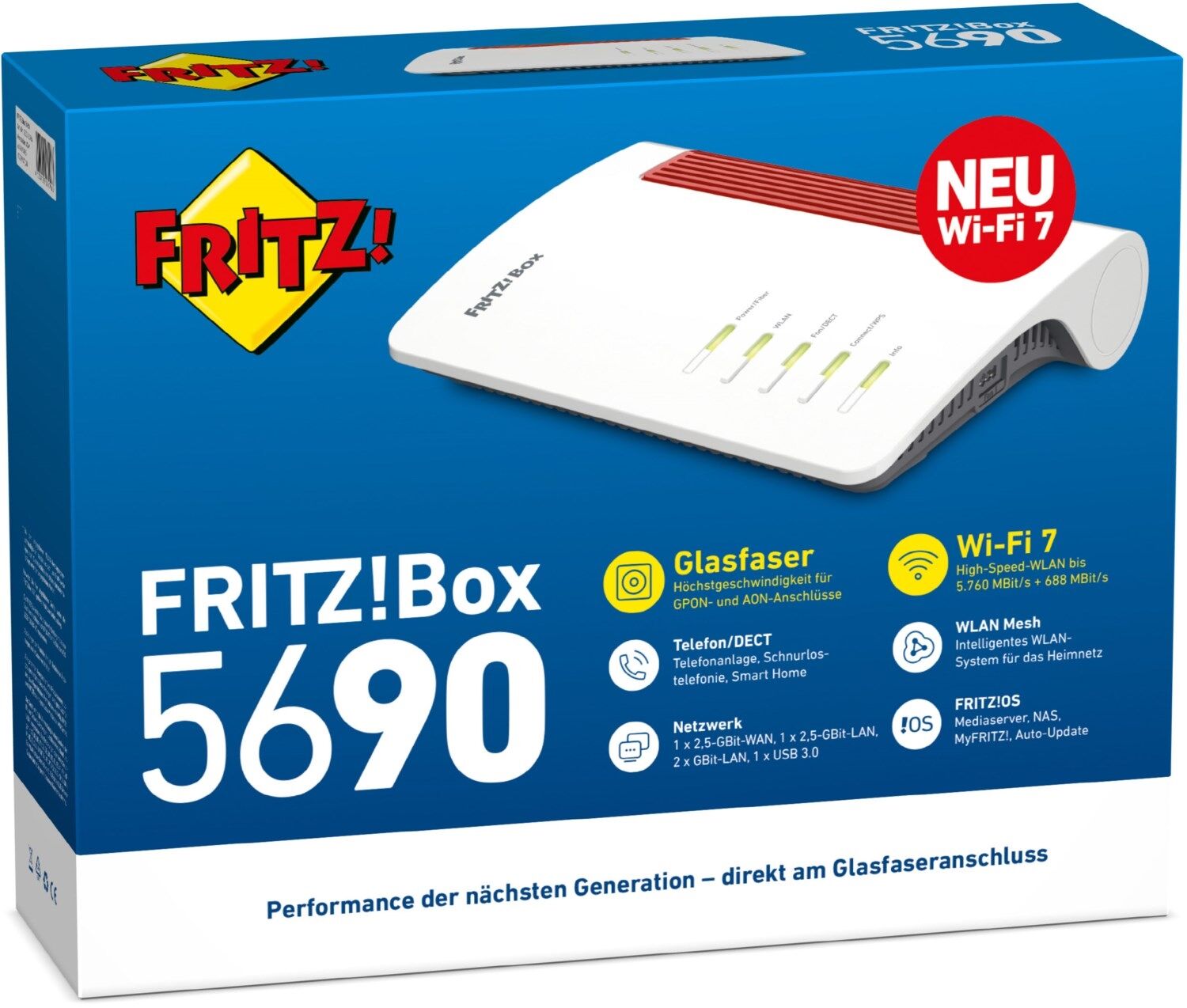 Mit Wi-Fi 7 bringt die FRITZ!Box 5690 ultraschnelles WLAN direkt an den Glasfaseranschluss. Der Wi-Fi 7 Standard sorgt auf 2,4 und 5 GHz für mehr Tempo, geringere Latenzen und starke Mesh-Performance - ideal für VR, Cloud-Dienste, Gaming und zahlreiche gleichzeitig genutzte Anwendungen. Die Kombination aus geringer Latenz und hohem Durchsatz sorgt für eine effiziente und stabile drahtlose Kommunikation. Auch aktuelle Anwendungen profitieren spürbar von schnelleren Verbindungen, sogar über große Distanzen und für viele mobile Geräte.