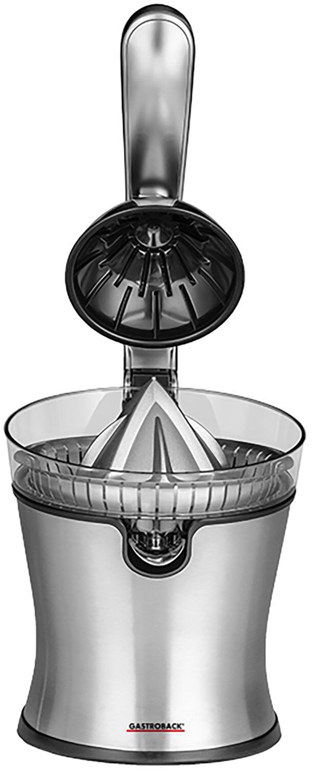 Hebel-Pressarm sorgt für eine optimale Saftausbeute Automatischer Anlauf durch Druck auf den Presskegel Massives Gehäuse aus Aluminiumguss, gebürstet Saftschale mit hochklappbarem Saftauslauf 2 Edelstahl-Siebeinsätze für Säfte mit oder ohne Fruchtfleisch Anbauteile spülmaschinengeeignet Professioneller Presskegel aus Metall für Zitrusfrüchte jeder Art geeignet