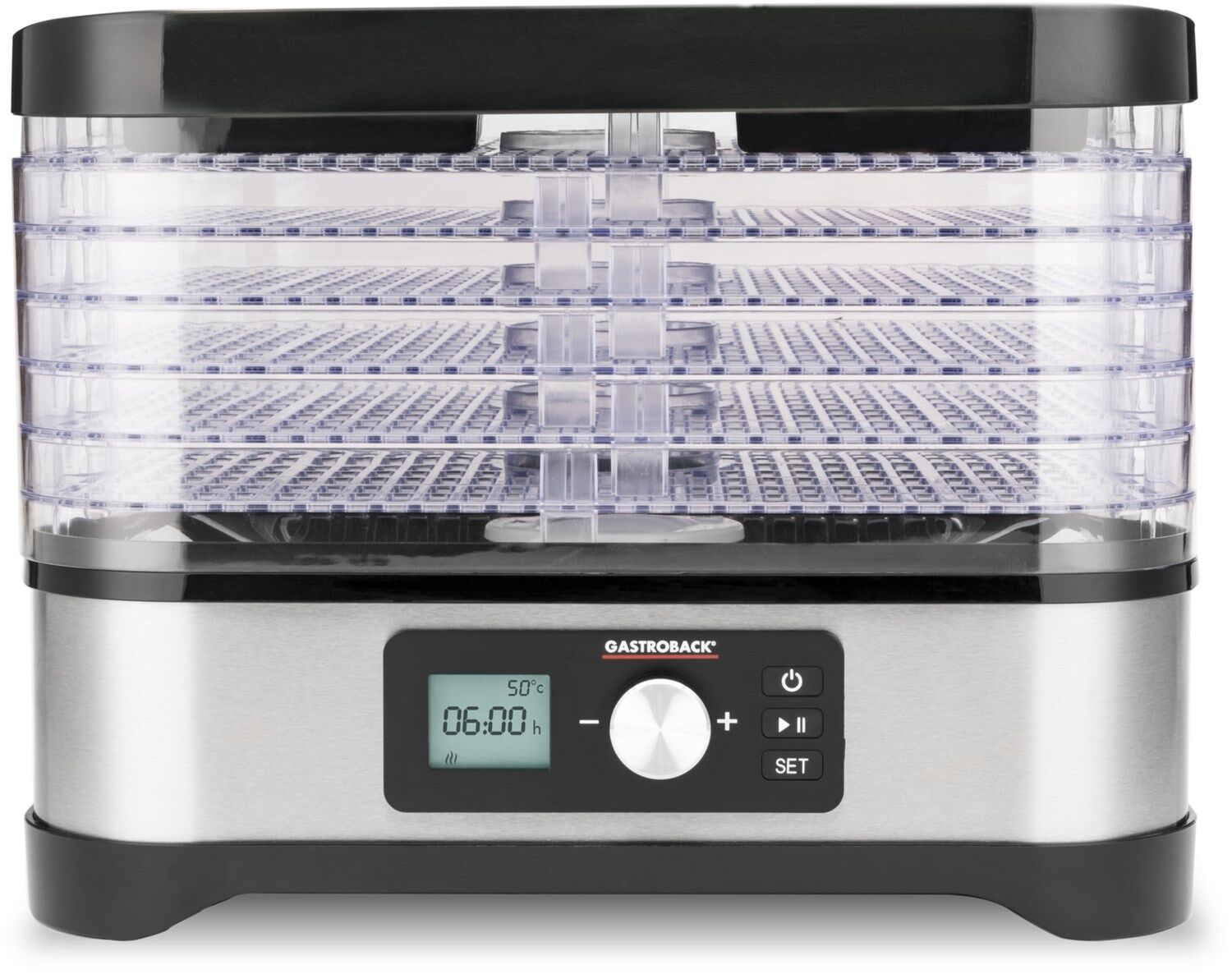 - 6 Dörrgitter (BPA frei), Dörrfläche 800 cm2 pro Gitter, insgesamt 4.800 cm2
