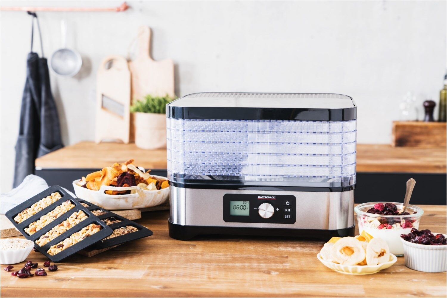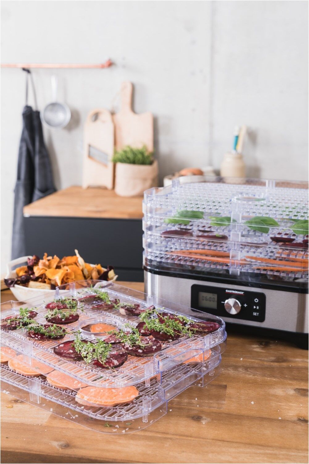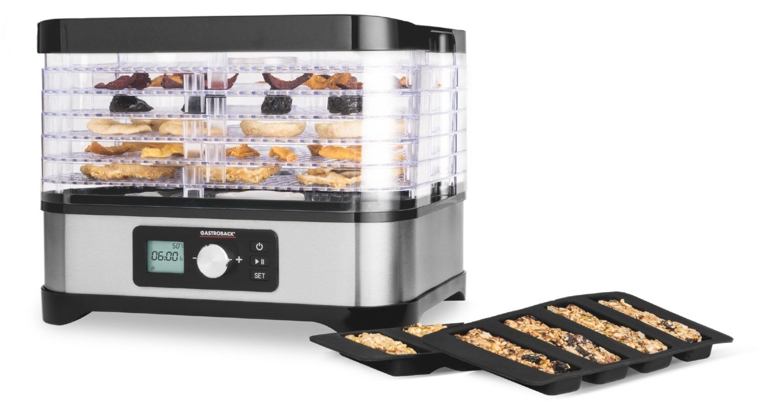 - Dörrautomat für gesunde Snacks und Süßigkeiten, Gemüsechips, Trockenfrüchte, Müsliriegel, Fruchtleder, getrocknete Kräuter, Tees, Dörrfleisch uvm