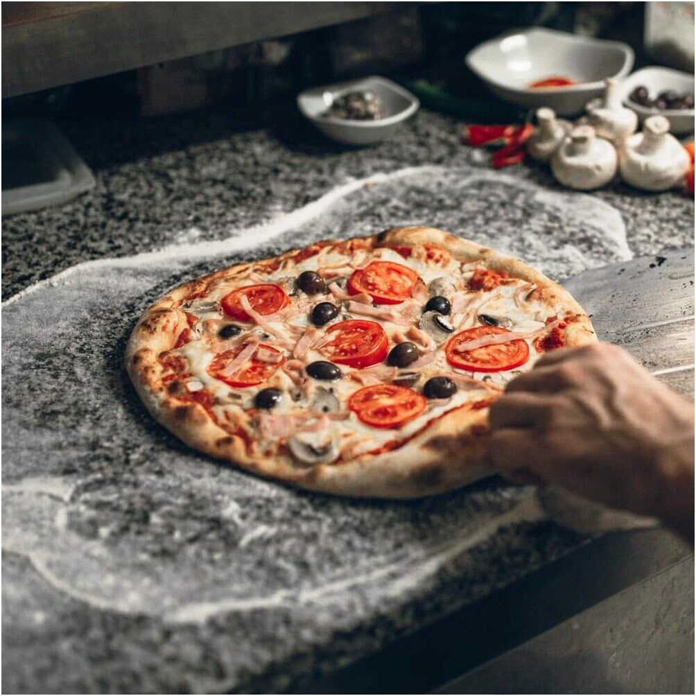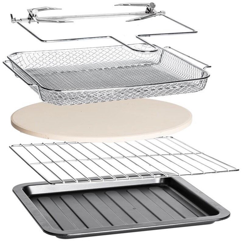 - 5 in 1: Pizzaofen, Heißluftfritteuse, Mini-Backofen, Grill-Drehspieß und Dörrgerät