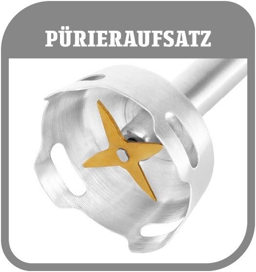 - Inklusive Pürieraufsatz, Emulgieraufsatz, Multizerkleinerer (500ml), Mixbehälter (700 ml), Schneebesenaufsatz und Milchaufschäumeraufsatz