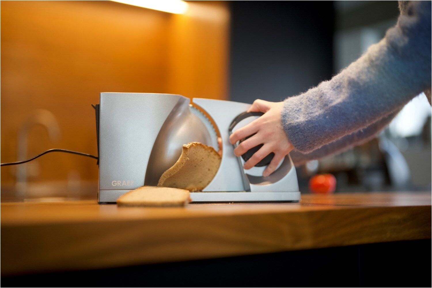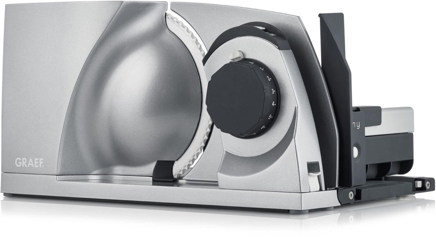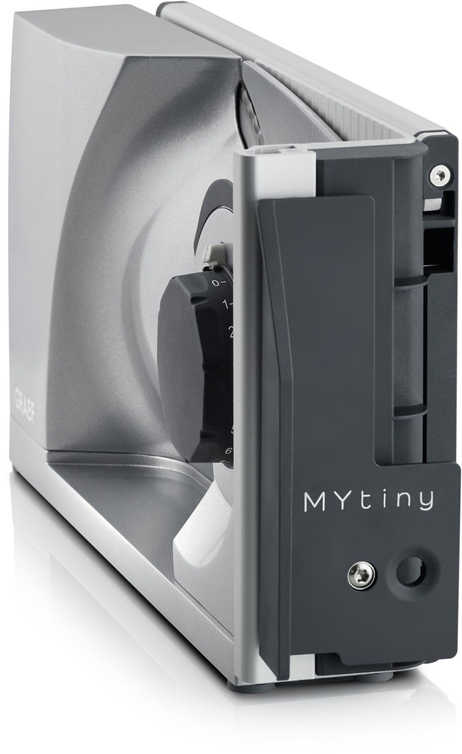 Der MYtiny liefert mit seinem 170 mm Wellenschliffmesser feinste Schnitte in stufenloser Schnittstärkeneinstellung von 0–15 mm. Die zentrale Bedienheit ist mit einer Einschaltsicherung ausgestattet und verriegelt Anschlag und Schalter wenn der MYtiny transportiert oder verstaut wird.