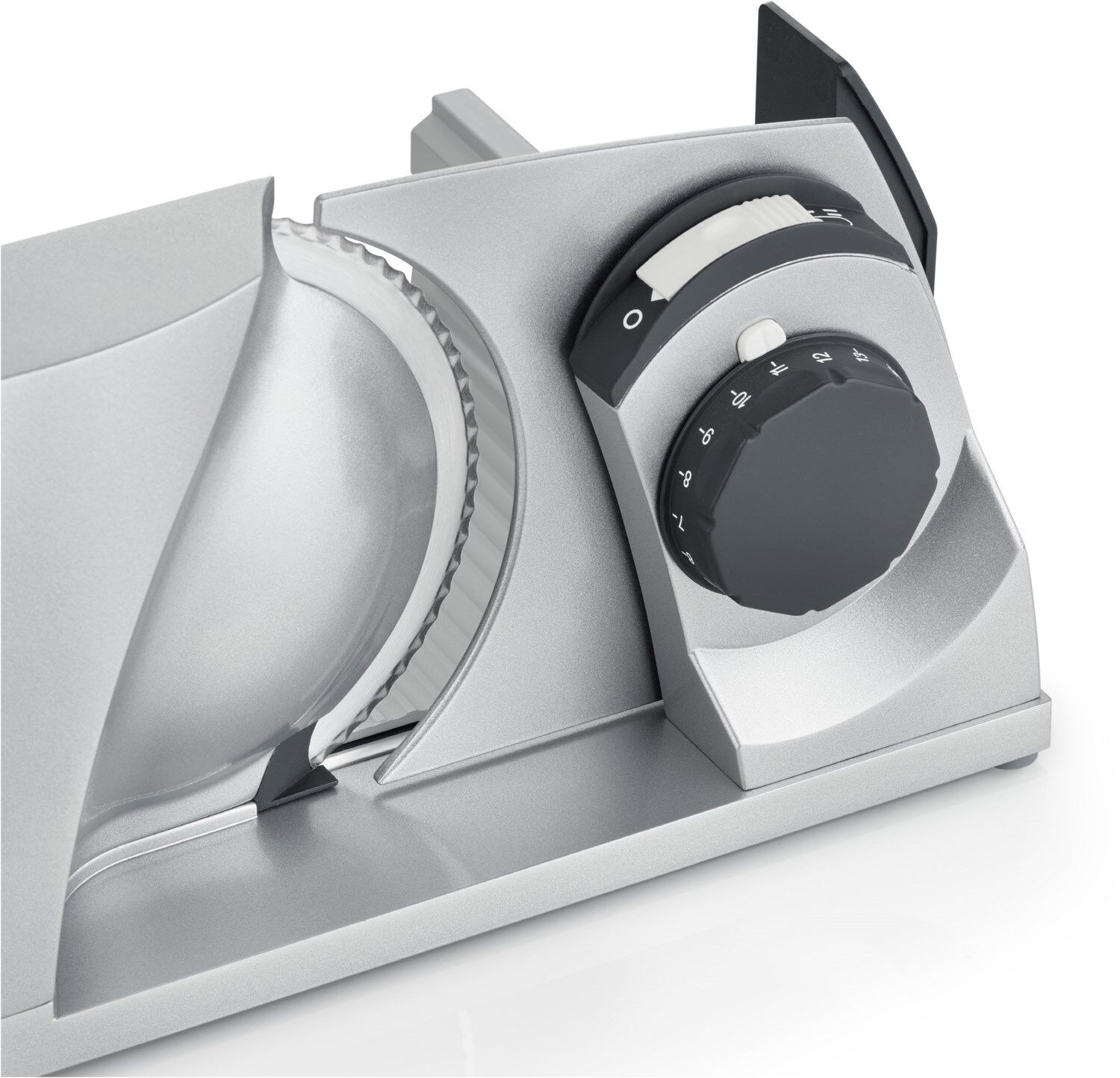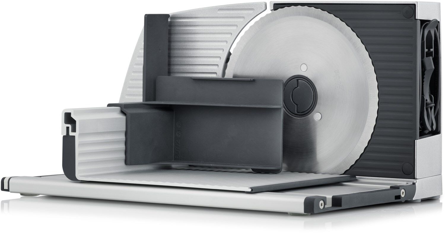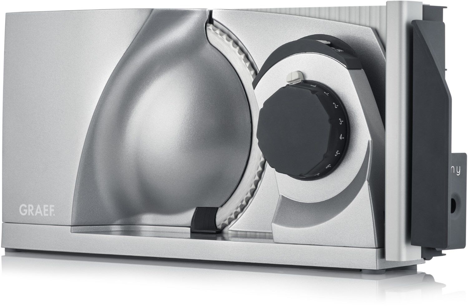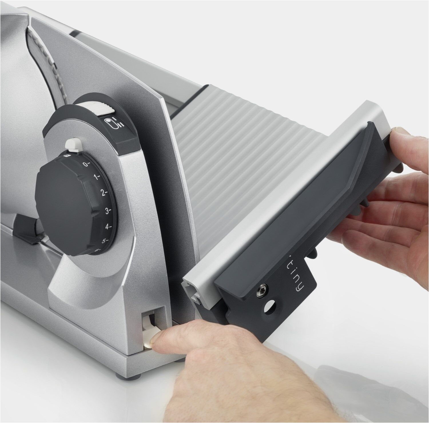 Der MYtiny liefert mit seinem 170 mm Wellenschliffmesser feinste Schnitte in stufenloser Schnittstärkeneinstellung von 0–15 mm. Die zentrale Bedienheit ist mit einer Einschaltsicherung ausgestattet und verriegelt Anschlag und Schalter wenn der MYtiny transportiert oder verstaut wird.