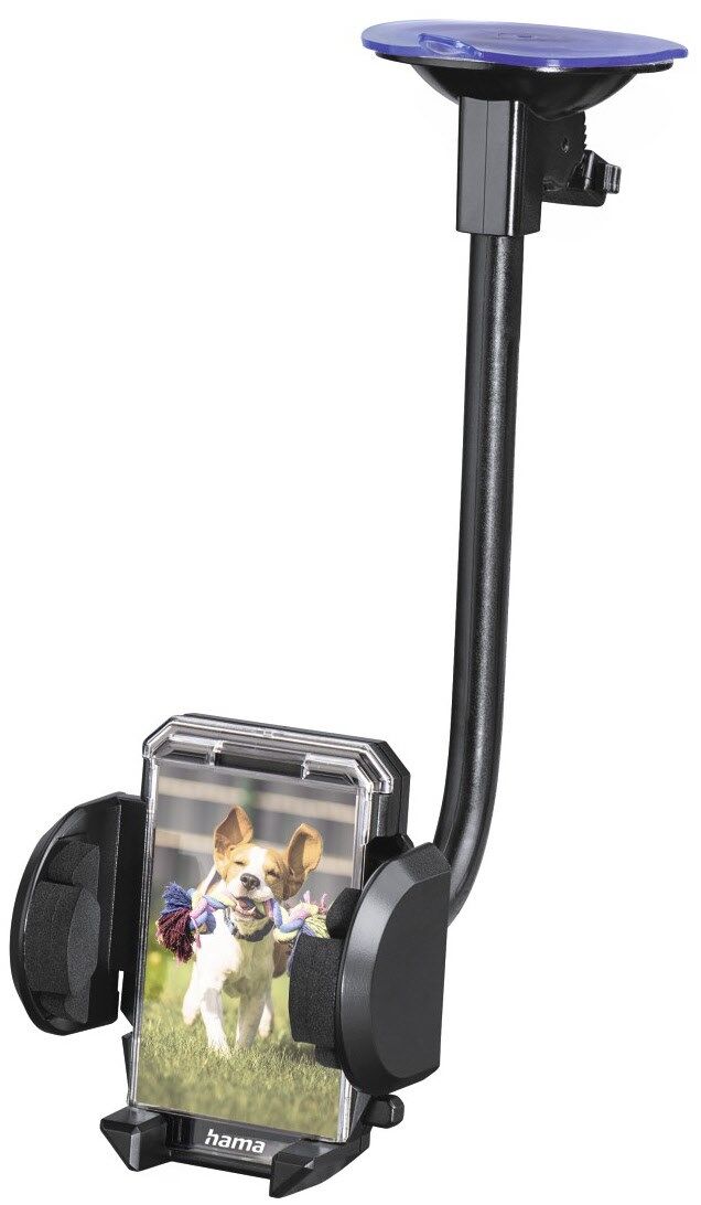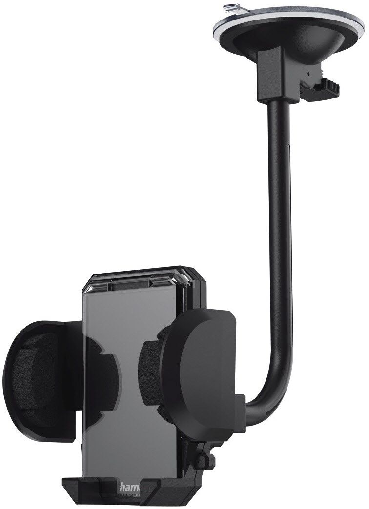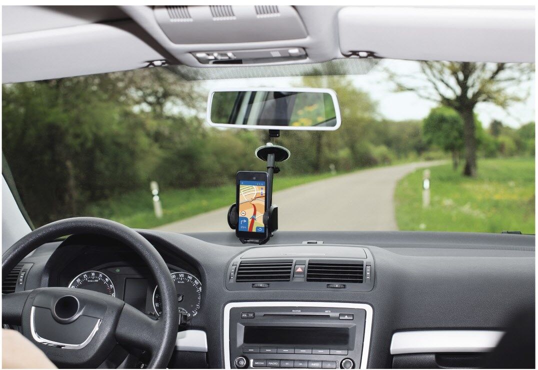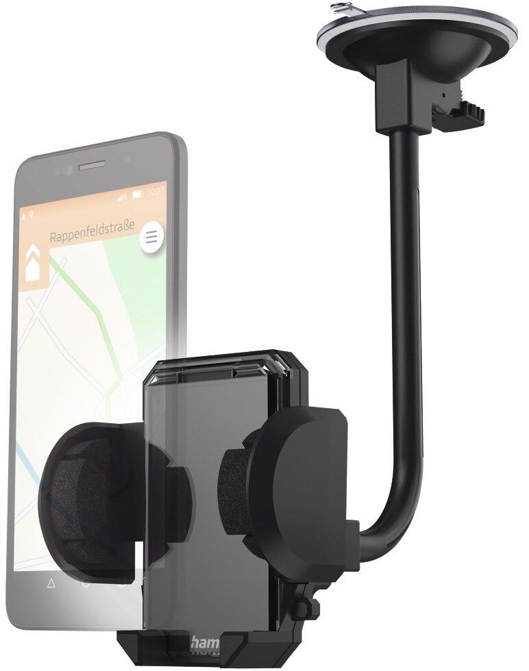 - An der Frontscheibe wird der Halter mit dem langen, flexiblen Schwenkarm mittels Saugnapf befestigt, somit beste Erreichbarkeit und Positionierung nach Wunsch möglich