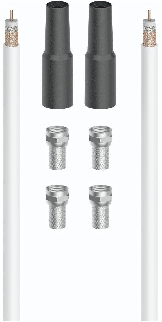 - 7-teiliges Set bestehend aus: 1 Koax-Kabel (Weiß), 4 F-Stecker, 2 Wetterschutztüllen