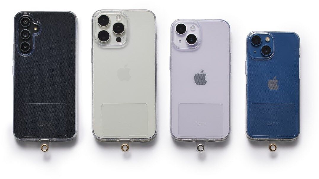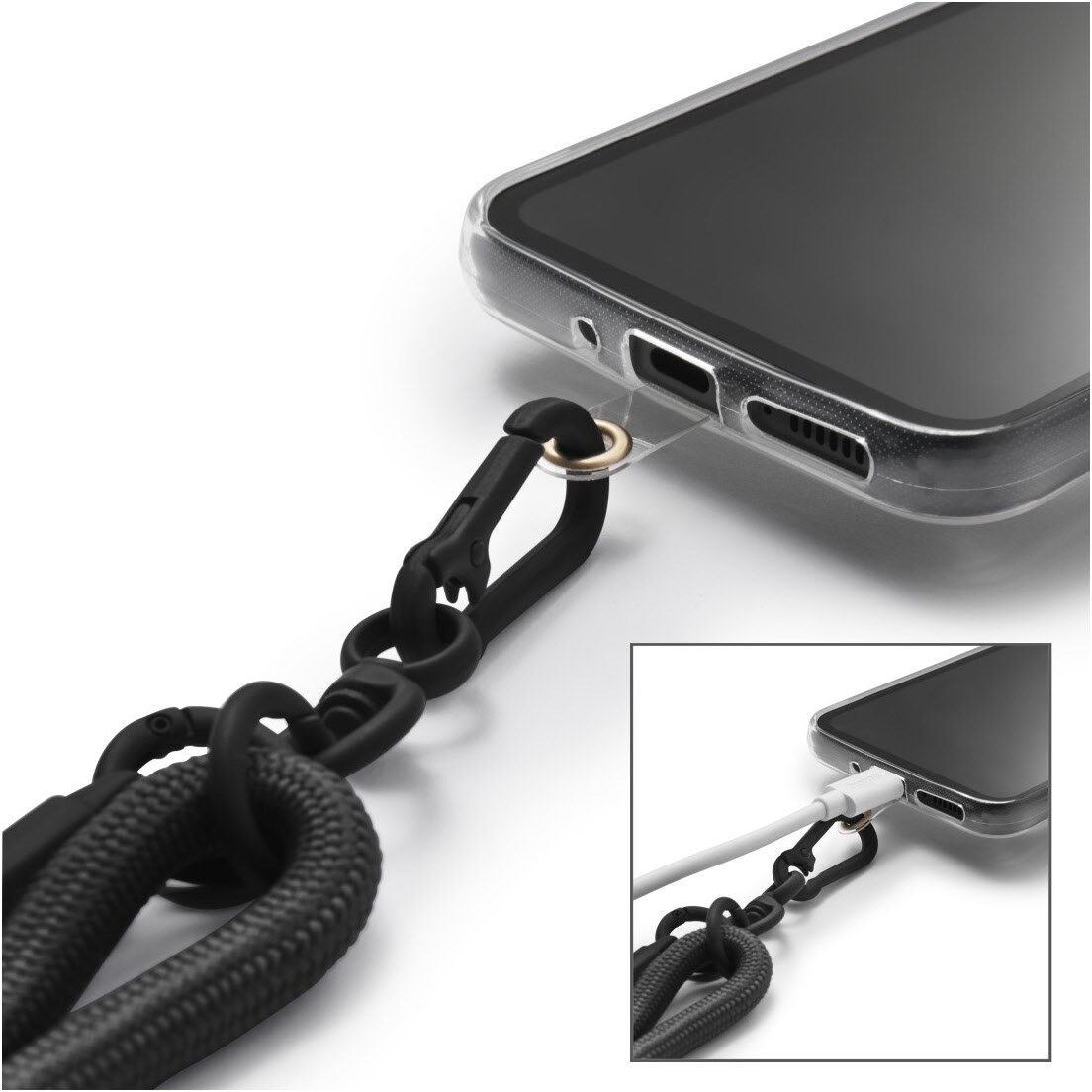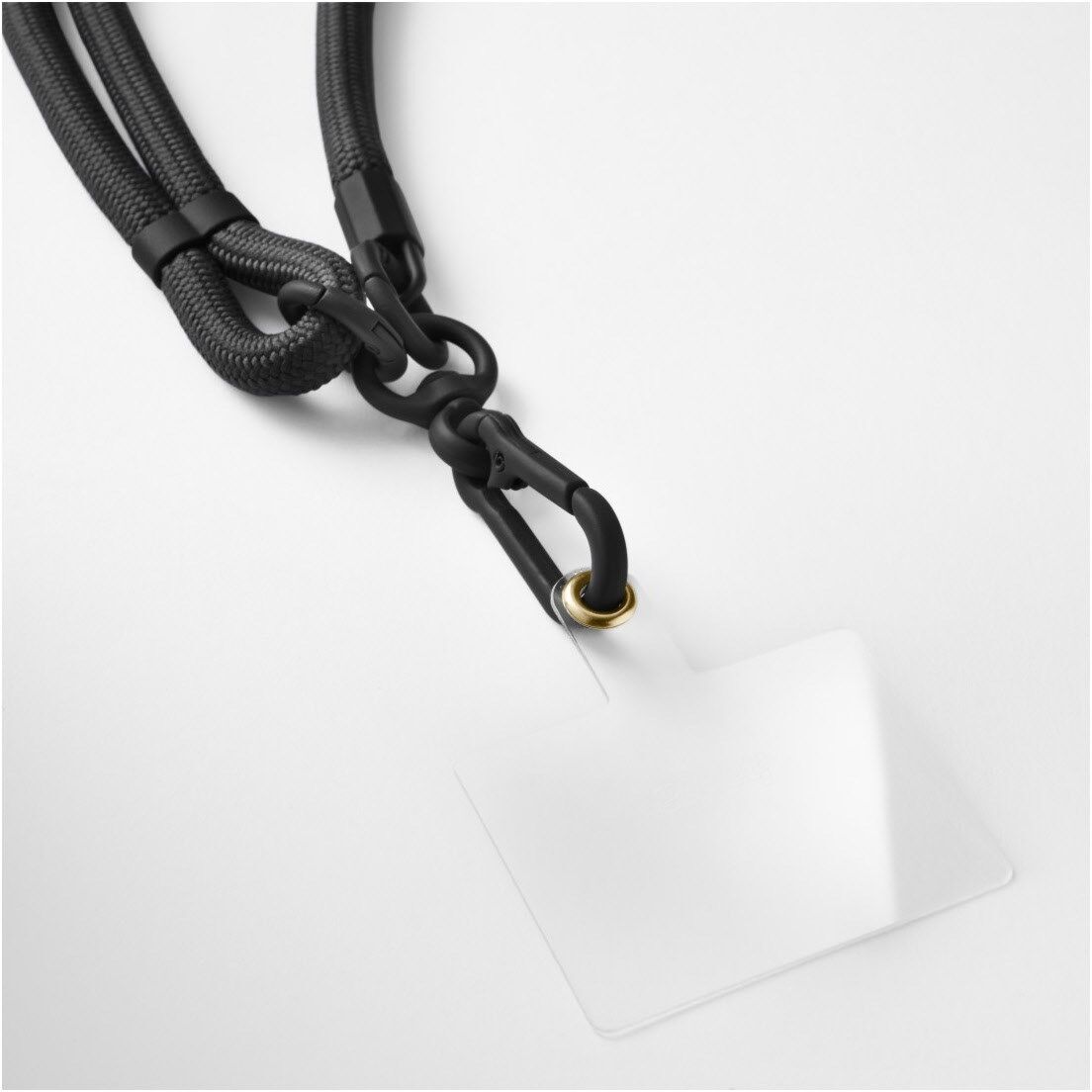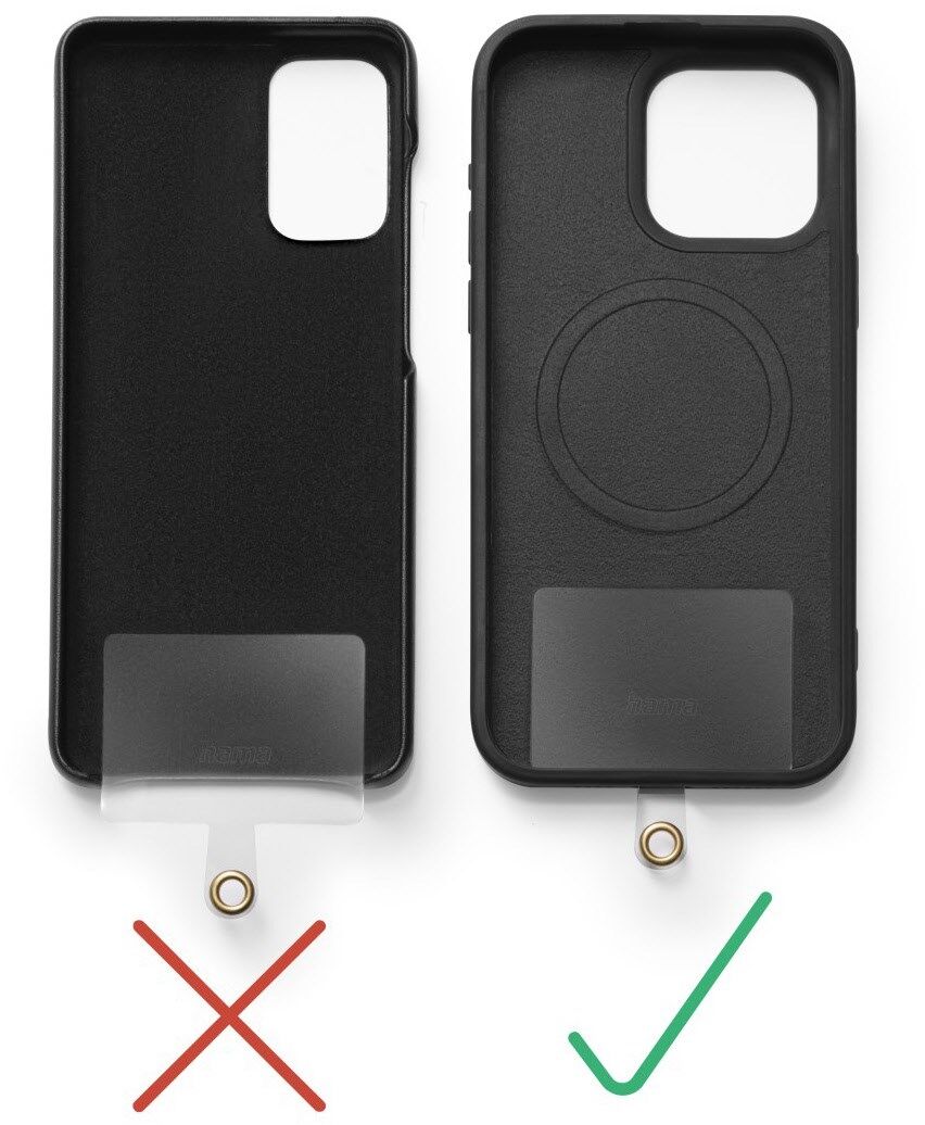- Unkompliziert befestigen: transparentes Plättchen in T-Form in die Innenseite der Handyhülle einlegen, Lasche an der Aussparung der Ladebuchse durchziehen, dass Patch der Handykordel kann dort belassen werden