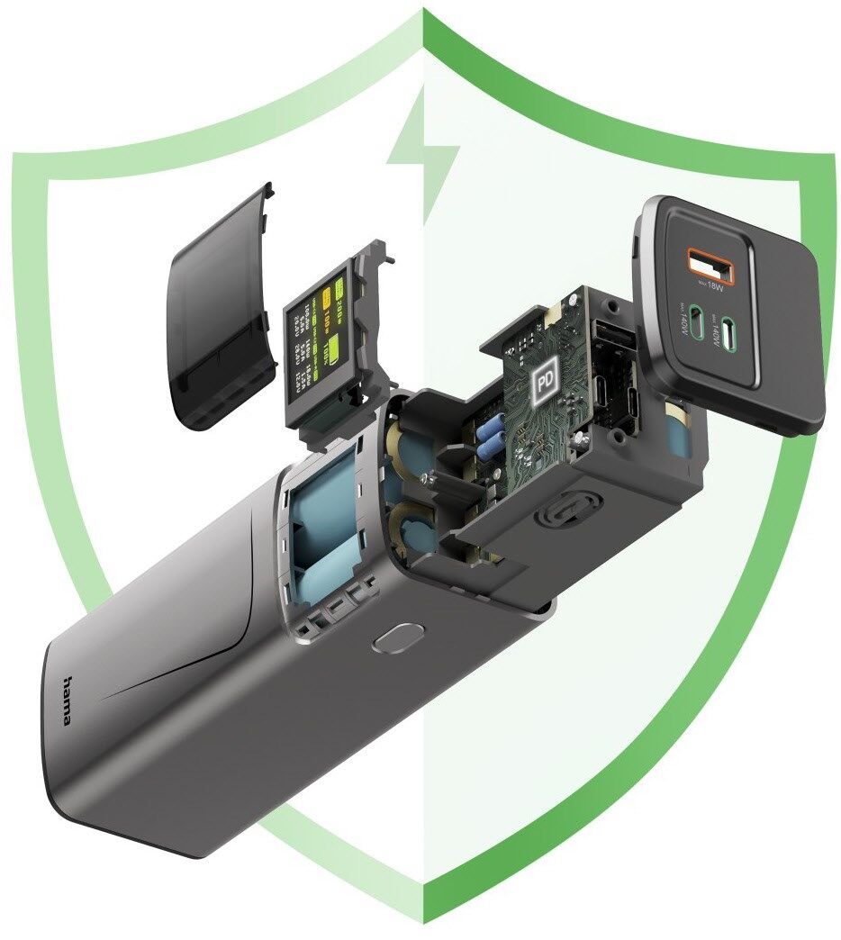 - Powerbank sorgt für den Energieschub unterwegs; das mobile Ladegerät kann an zwei USB-C-Buchsen und einer USB-A-Buchse drei Geräte gleichzeitig laden