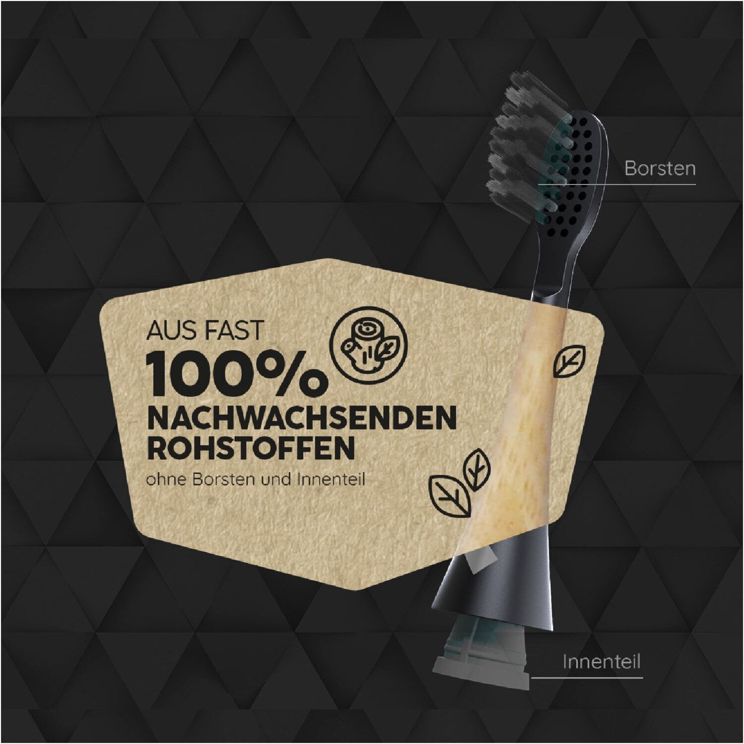 NACHHALTIGE MATERIALIEN: Die veganen Ersatzzahnbürsten (ohne Innenteil und Borsten) bestehen zu fast 100% aus nachwachsenden Rohstoffen.