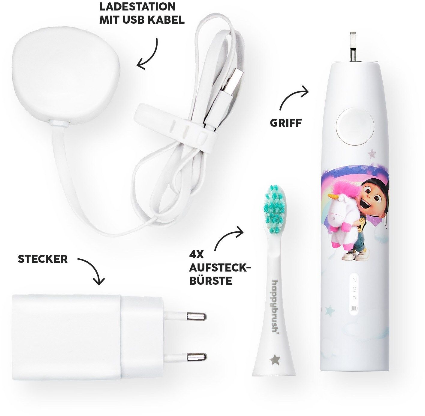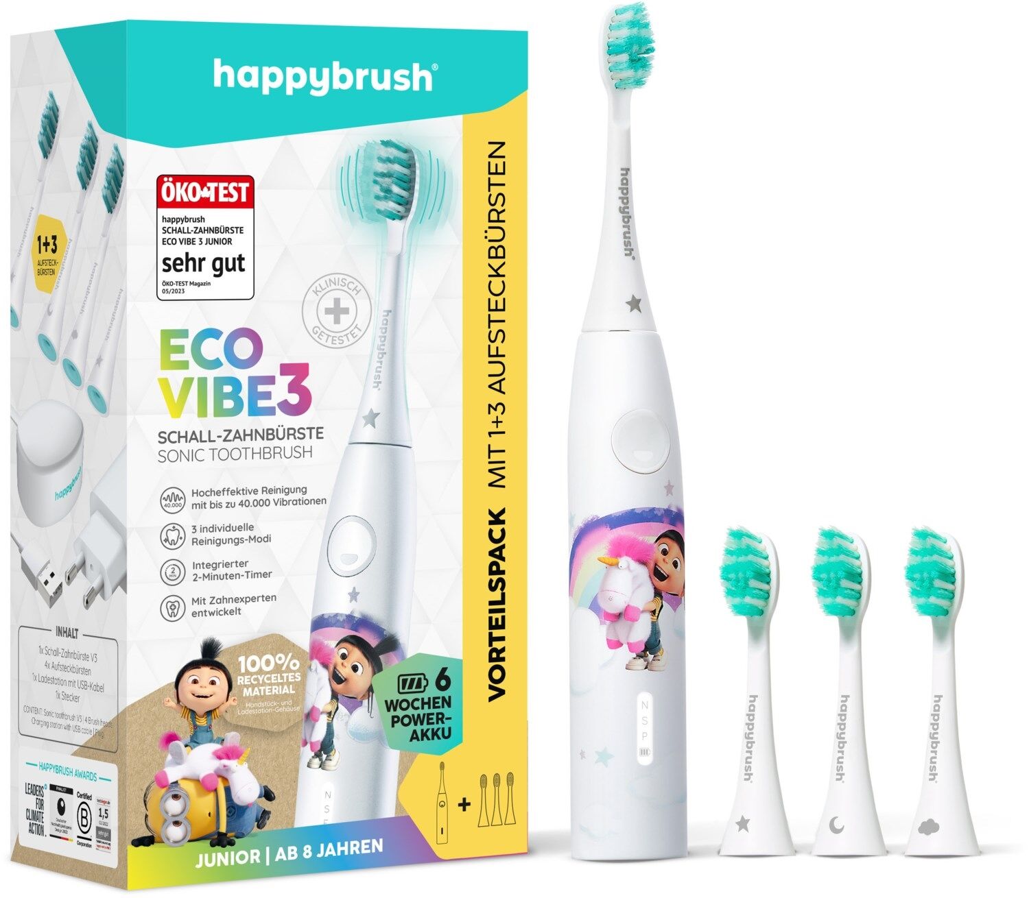 - Inhalt: 1x Elektrische Zahnbürste ECO VIBE 3 Junior, 4x Aufsteckbürsten, 1x magnetisches Ladegerät + USB-Kabel, 1x Stecker, Umverpackungen aus FSC-zertifiziertem Karton.