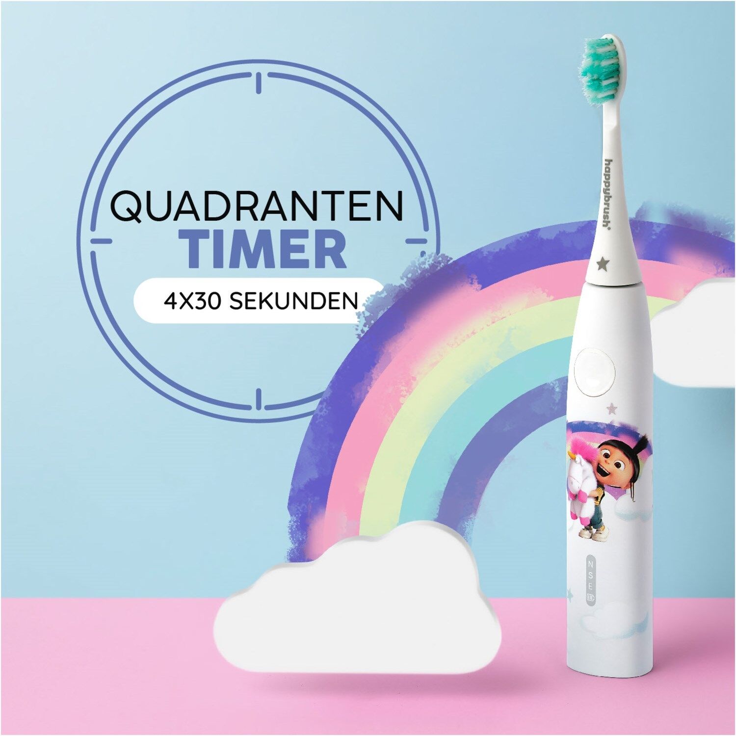 Ich sorge mit hoch-effektiven Vibrationen, individuellen Reinigungs-Modi und hochwertigen TripleBorsten für eine gründliche sanfte Reinigung deiner Kinderzähne.