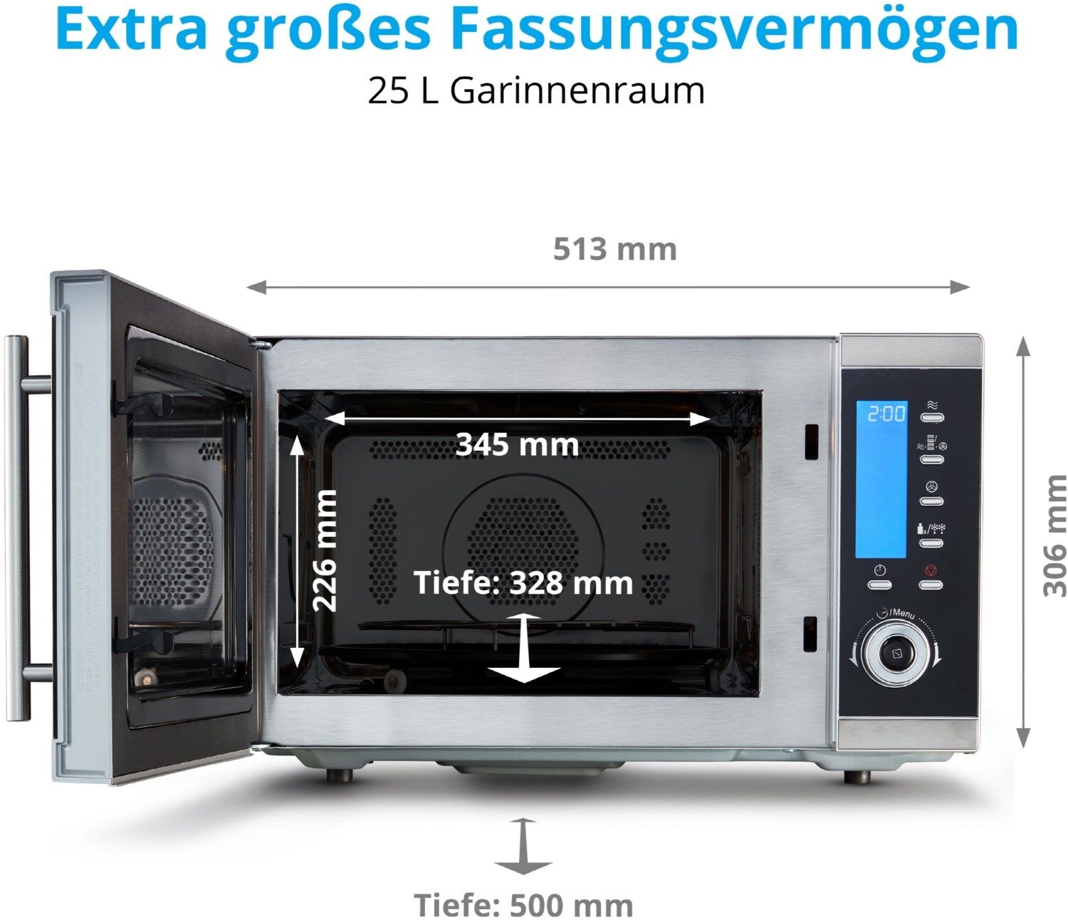- 3 Grillfunktionen (Obergrill, Untergrill, Doppelgrill), 4 Kombinationsmöglichkeiten (Mikrowelle &Heißluft), Auftaufunktion