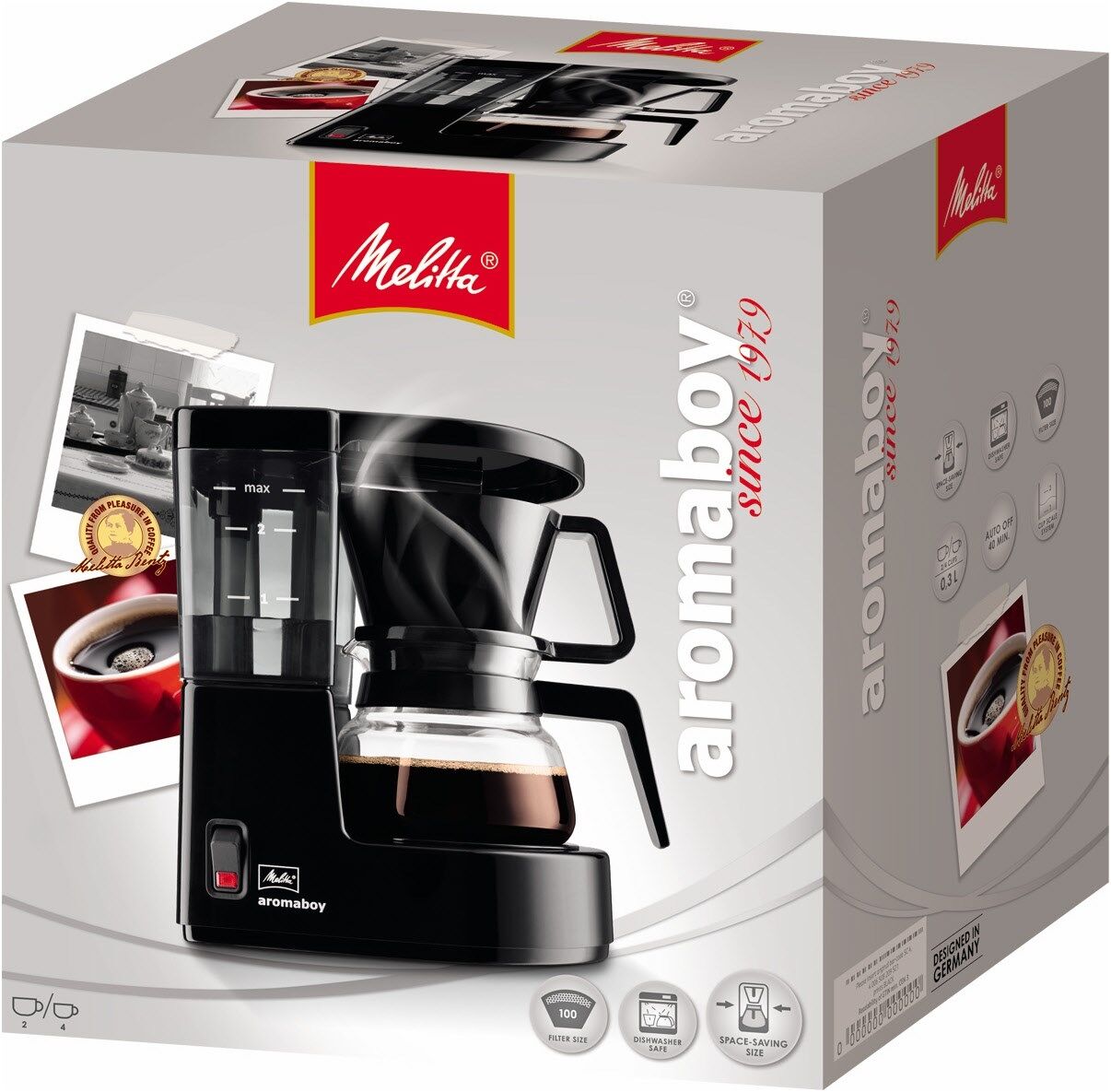 Die Retro Kaffeemaschine: Schon seit 1979 begeistert unser Aromaboy® mit großem Kaffeegenuss auf kleinstem Raum. Da die 2-Tassen Filterkaffeemaschine so kompakt ist, findet sie in wirklich jeder Küche ihren Platz. Die spülmaschinengeeigneten Komponenten ermöglichen eine leichte Reinigung.