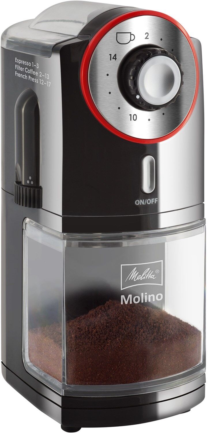 Für Genießer frisch gemahlener Kaffeebohnen – die elektrische Kaffeemühle von Melitta. Ein leistungsstarker Motor, ein individuell wählbarer Mahlgrad und die leicht zu reinigenden Einzelteile machen die Melitta Molino® zum perfekten Begleiter. Bohnen für Espresso oder auch Filterkaffee können mit dieser Kaffeemühle je nach Mahlgrad problemlos gemahlen werden.