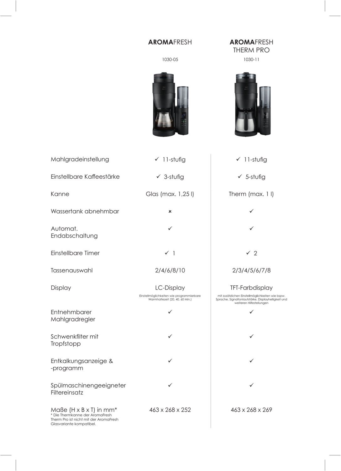 - Die AromaFresh Therm Pro ist eine Kaffeemaschine mit Mahlwerk. Mit ihrem Keramikmahlwerk bietet sie 11 Mahlgradeinstellungen, variabel von grob bis fein für präzises Mahlen.