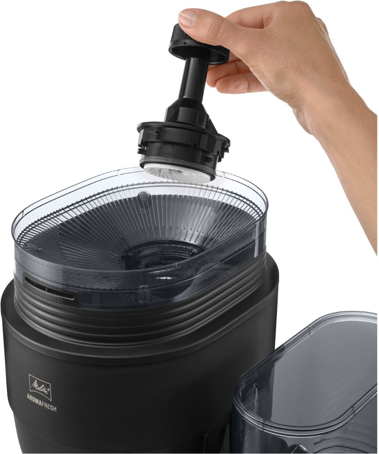 - Mahlwerk der Melitta® AromaFresh Therm Pro kann durch einen herausnehmbaren Mahlgradregler für eine intensive Reinigung freigelegt werden.