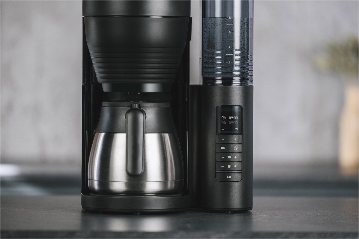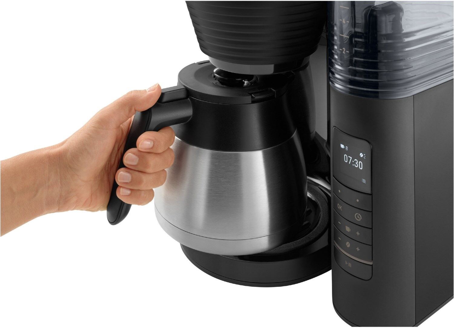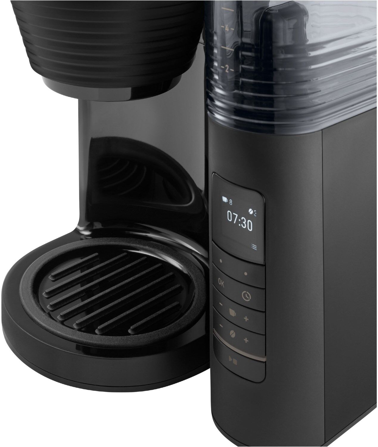 - Entnehmbarer Wassertank (seitlich angebracht) mit gut ablesbarer Tassen-Skalierung