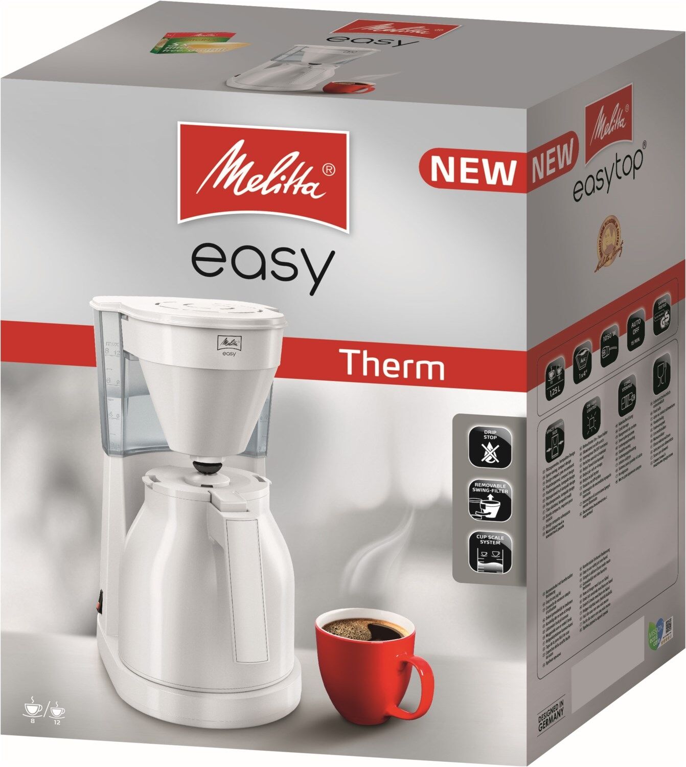 Eine kompakte und Kaffeemaschine, die dabei auch noch guten Filterkaffee zubereitet. Die Easy Therm Kaffeemaschine punktet besonders durch die mitgelieferte Thermkanne. Diese sorgt dafür, dass der frisch aufgebrühte Kaffee länger warmgehalten wird. Die spülmaschinengeeigneten Komponenten erleichtern die Reinigung zudem ungemein.
