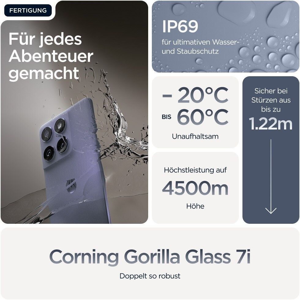 Die Leistung von Gorilla® Glass 7i basiert auf Labortests unter kontrollierten Bedingungen. Die tatsächliche Leistung kann je nach Verwendungszweck, Umgebungsbedingungen und anderen Faktoren variieren. Gorilla® Glass 7i wurde entwickelt, um die Haltbarkeit zu erhöhen und im Vergleich zu konkurrierendem Lithium-Aluminosilikat-Glas eine bessere Widerstandsfähigkeit bei Stürzen und Kratzern zu bieten, aber es ist nicht unzerstörbar und kann unter bestimmten Bedingungen trotzdem beschädigt werden. Benutzer sollten vorsichtig sein und ihre Geräte nicht unnötigen Risiken aussetzen.