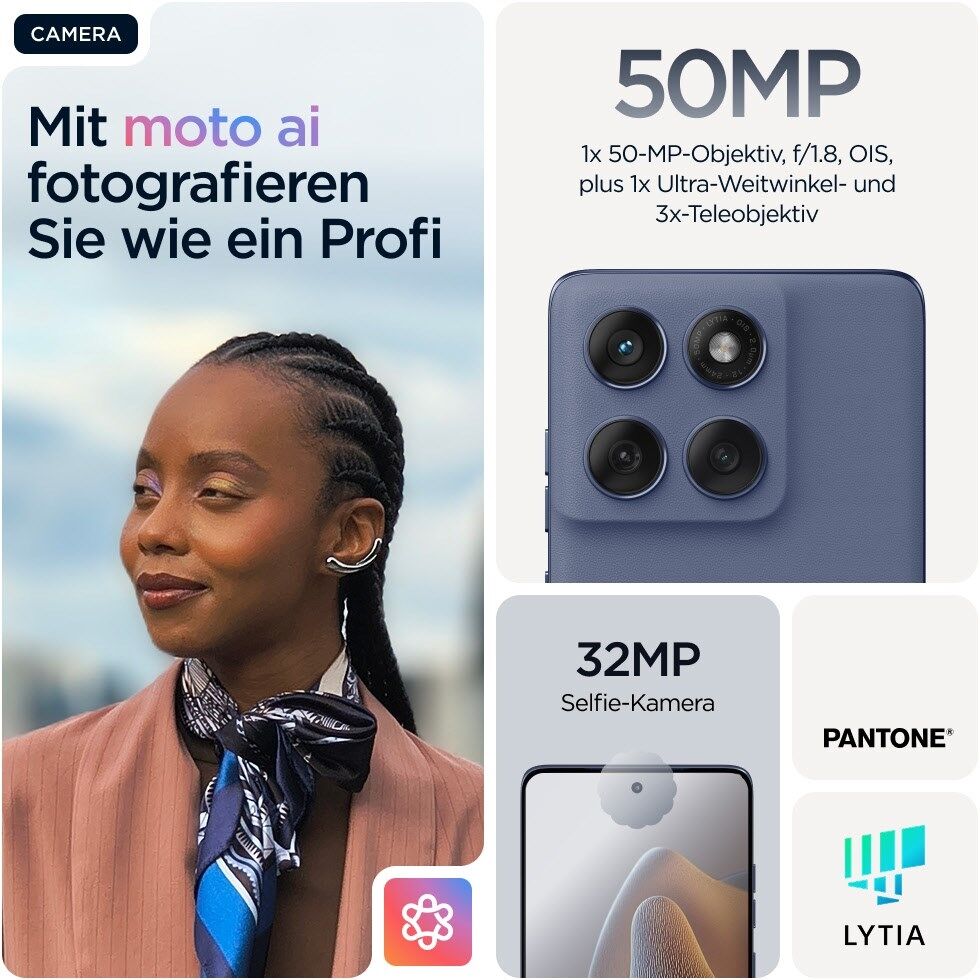 Für alle, die Qualität in jedem Foto erwarten: Die 50 MP-Ultra-Pixel-Hauptkamera ist mit dem hochmodernen Sony LYTIA™ 700C-Sensor und optischer Bildstabilisierung (OIS) ausgestattet. Die nahtlose Integration von Moto AI sorgt für naturgetreue Farben und Texturen, die deine Fotos einzigartig machen.