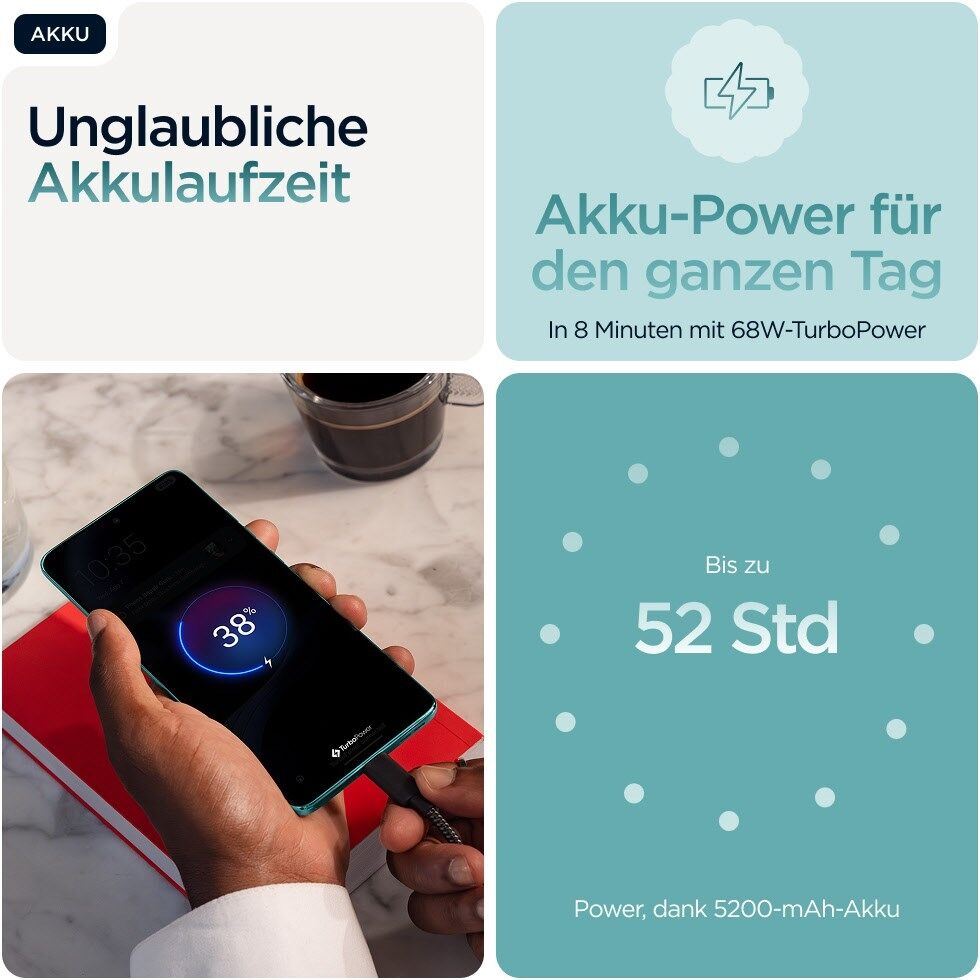 Motorola 68 W TurboPower™-Ladegerät erforderlich; separat erhältlich. Durchschnittsnutzer können nach 8 Minuten Aufladen bis zu 12 Stunden Akkulaufzeit erzielen. Der Akku muss möglichst stark entladen sein. Der Lade-Boost muss aktiviert sein. Der Ladevorgang verlangsamt sich mit steigendem Ladezustand.