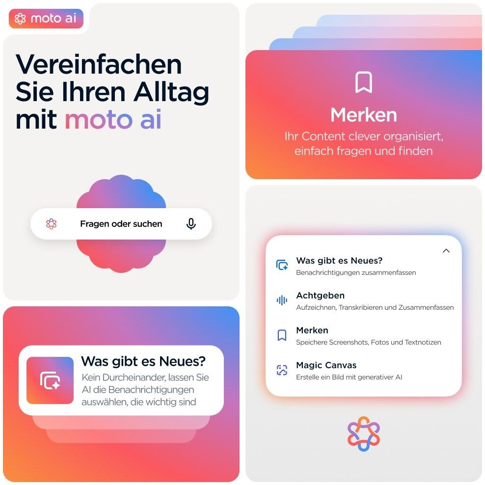 Moto AI ist nicht einfach nur ein weiterer Sprachassistent - es ist eine nahtlose, intelligente Ebene die sich durch dein gesamtes Smartphone zieht. Entwickelt, um dein Erlebnis zu verbessern, macht Moto AI alltägliche Momente einfacher und intuitiver - von der Aufnahme des perfekten Fotos bis hin zur Organisation deiner Benachrichtigungen. Mit Funktionen wie "Was gibt es Neues?" für priorisierte Updates und "Style-Anpassung", um deine Wallpaper an deinen Stil anzupassen, ist es immer einen Schritt voraus und passt sich dir an. Moto AI arbeitet im Hintergrund, erkennt den Kontext und passt sich deinen Vorlieben an, damit sich dein Gerät mehr wie eine natürliche Erweiterung deiner selbst anfühlt - mühelos, intelligent und persönlich.
