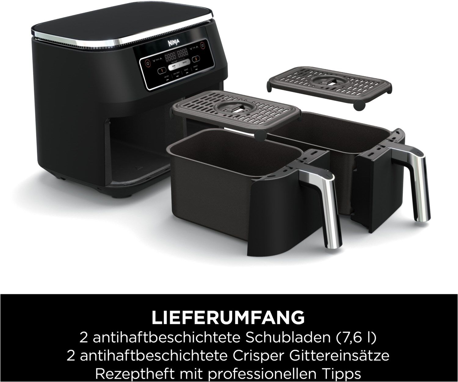 Die beliebteste Dual Zone Heißluftfritteuse von Ninja ist jetzt mit 4 Zubereitungsfunktionen erhältlich - Air Fry (Heißluft-Frittieren), Max Crisp (Max Crisp), Roast (Braten) und Reheat (Aufwärmen).