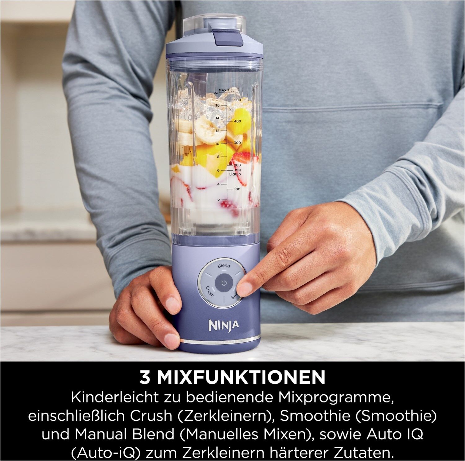 Die Auto-iQ-Technologie mit zwei automatischen Programmen, einschließlich Smoothie (Smoothie) und Crush (Zerkleinern) sowie dem Manual-Blend-Modus (Manuelles Mixen) nimmt Ihnen die Arbeit ab.
