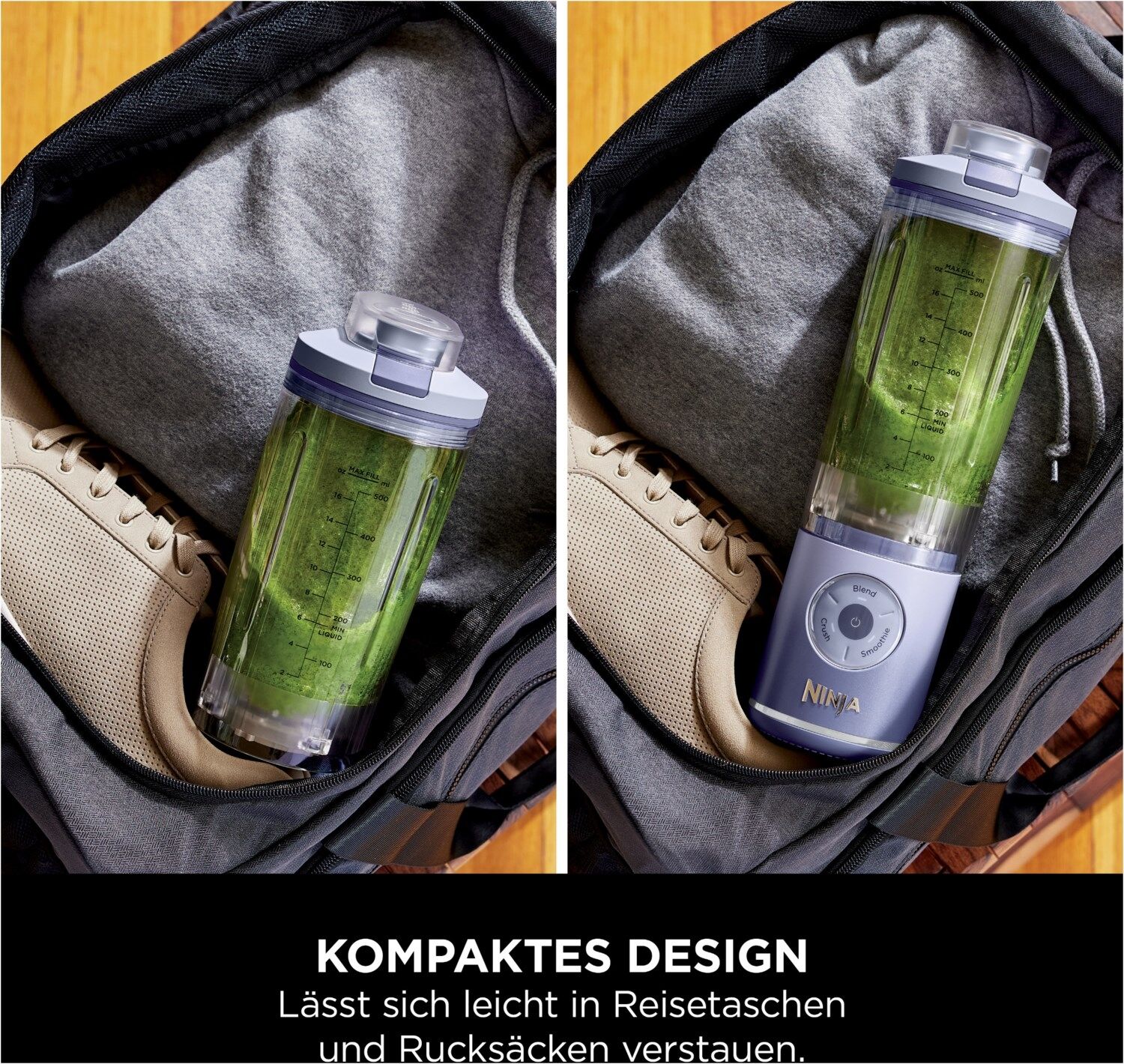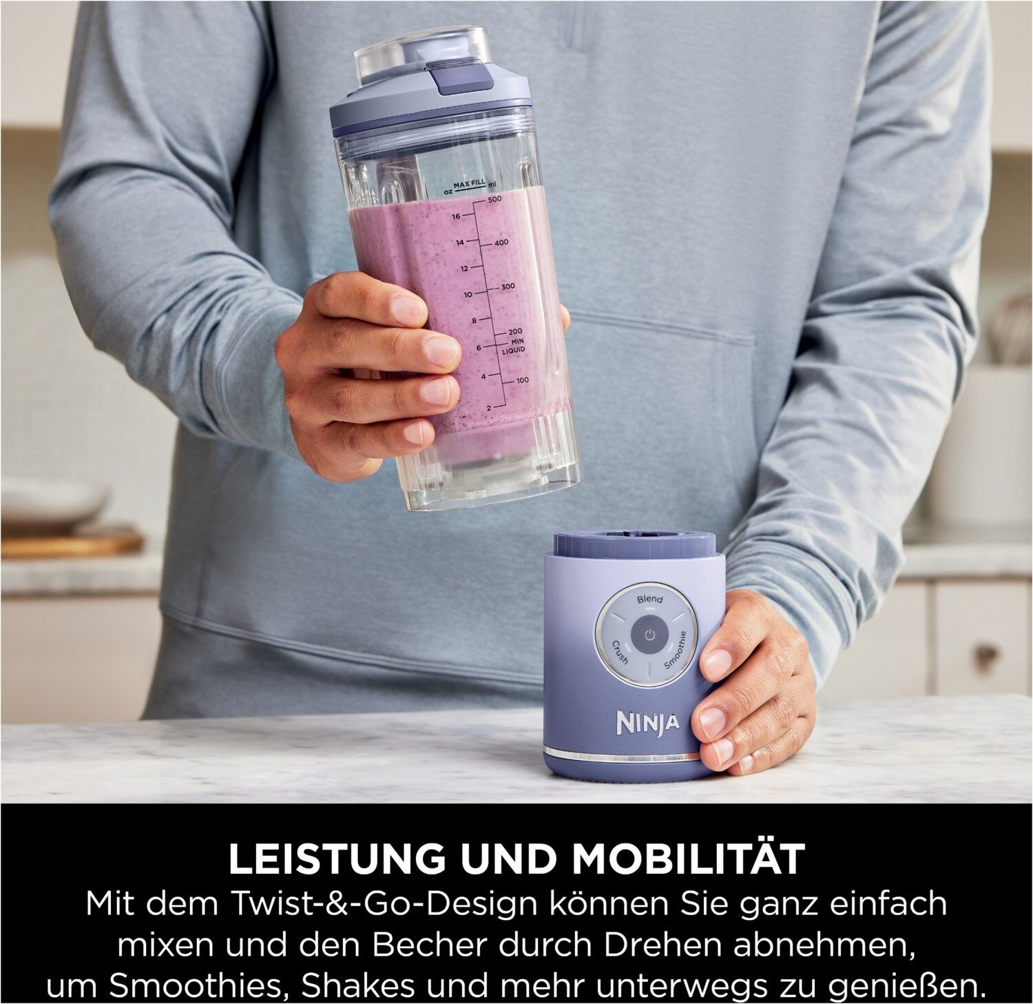 - Beinhaltet: Ninja Blast Motorbasis, 570 ml* Twist & Go-Becher mit integrierter CrushBlade, auslaufsicherem Deckel, Ladekabel und Rezeptheft