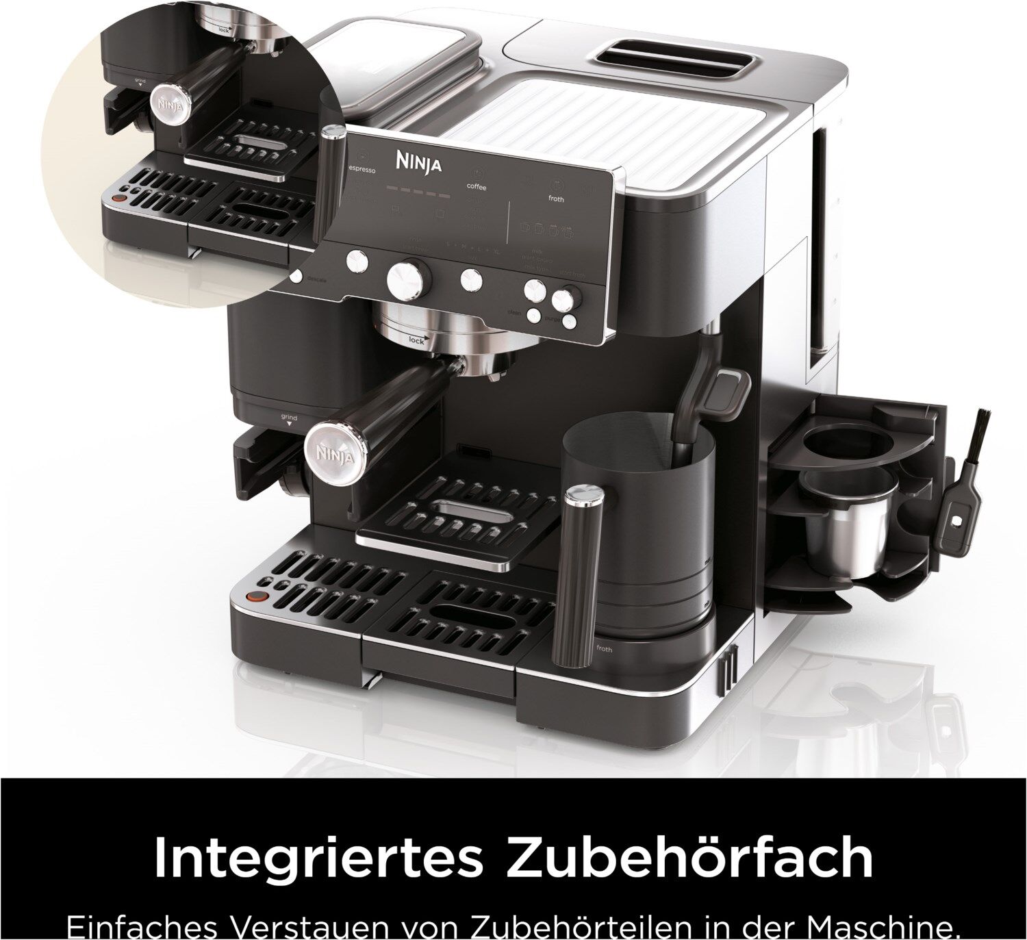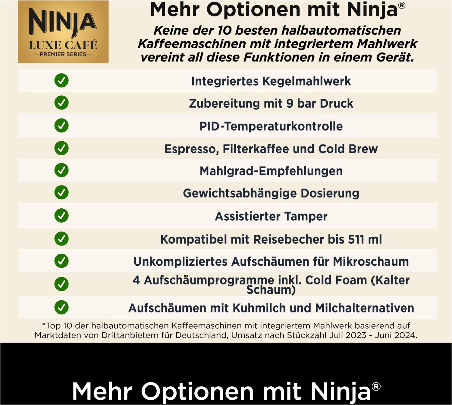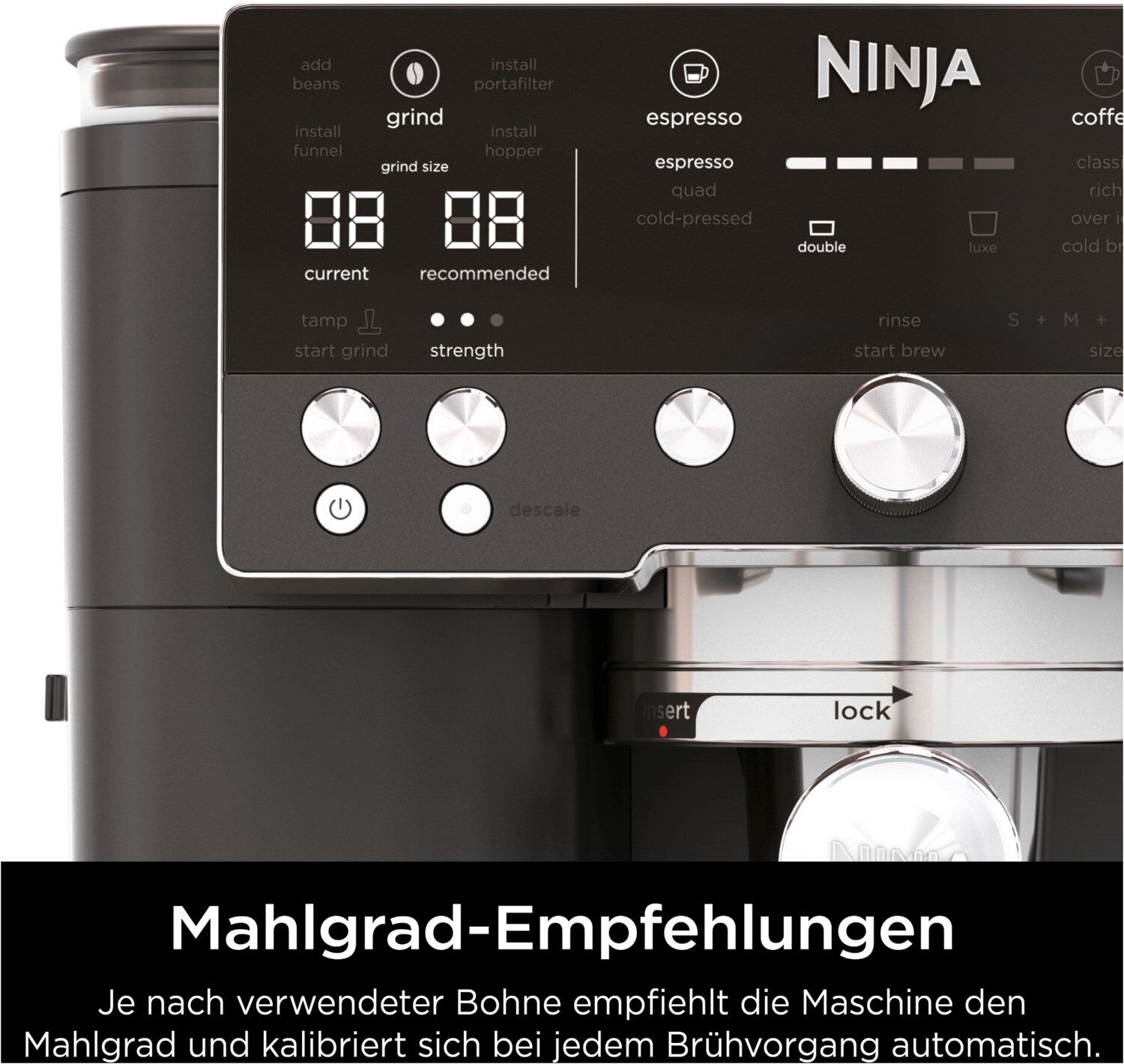- Lieferumfang: Siebträger und 3 Baskets (Single, Double und Luxe), Tamper, Trichter, Milchkännchen mit integriertem Schneebesen, integriertes Mahlwerk, Reinigungsbürste, Starterpaket, Reinigungsset und Rezeptheft.